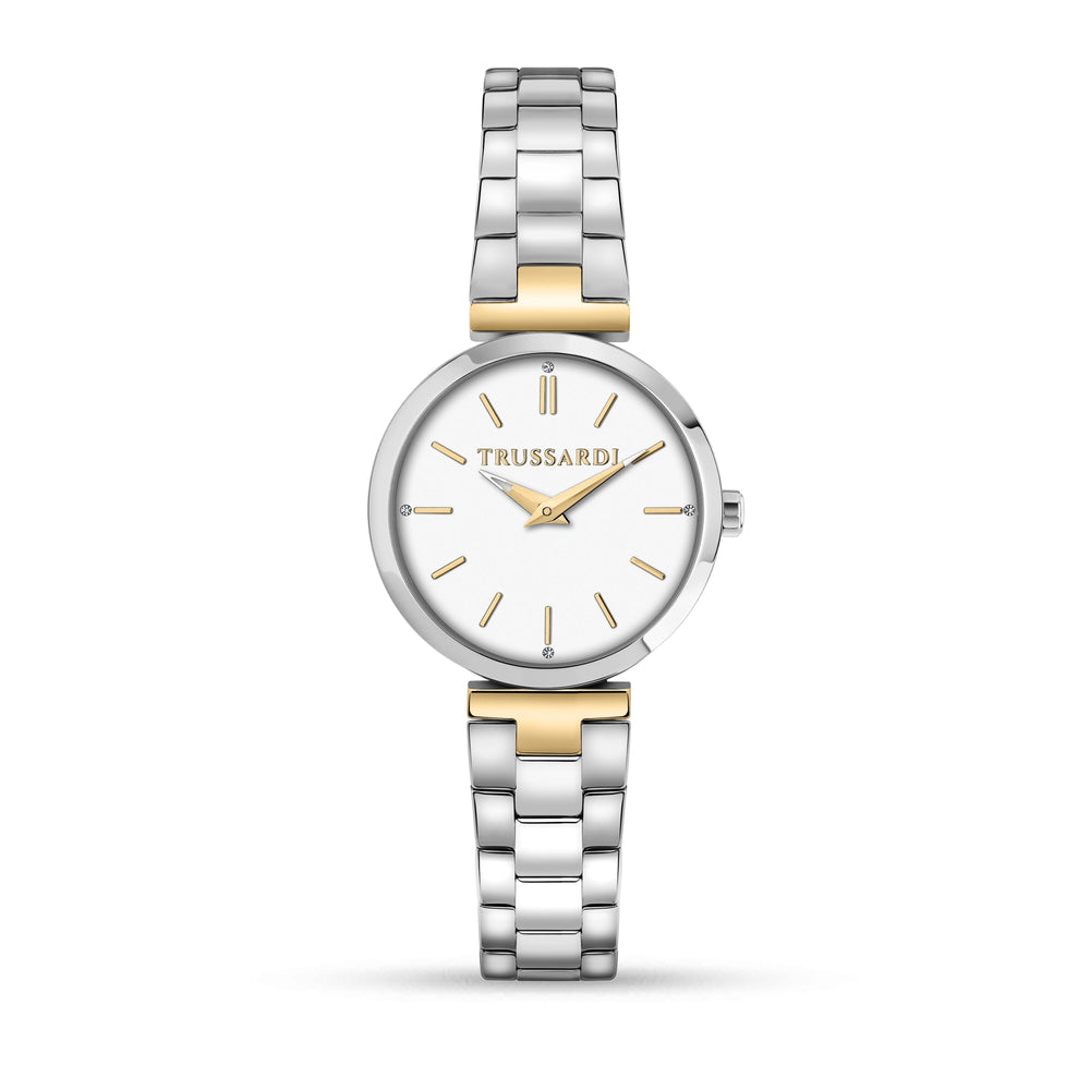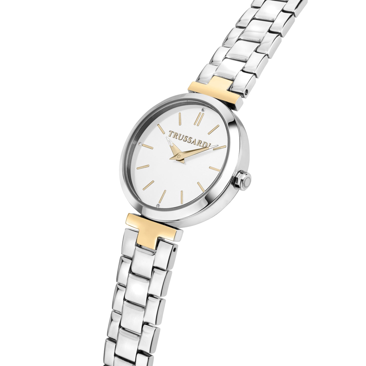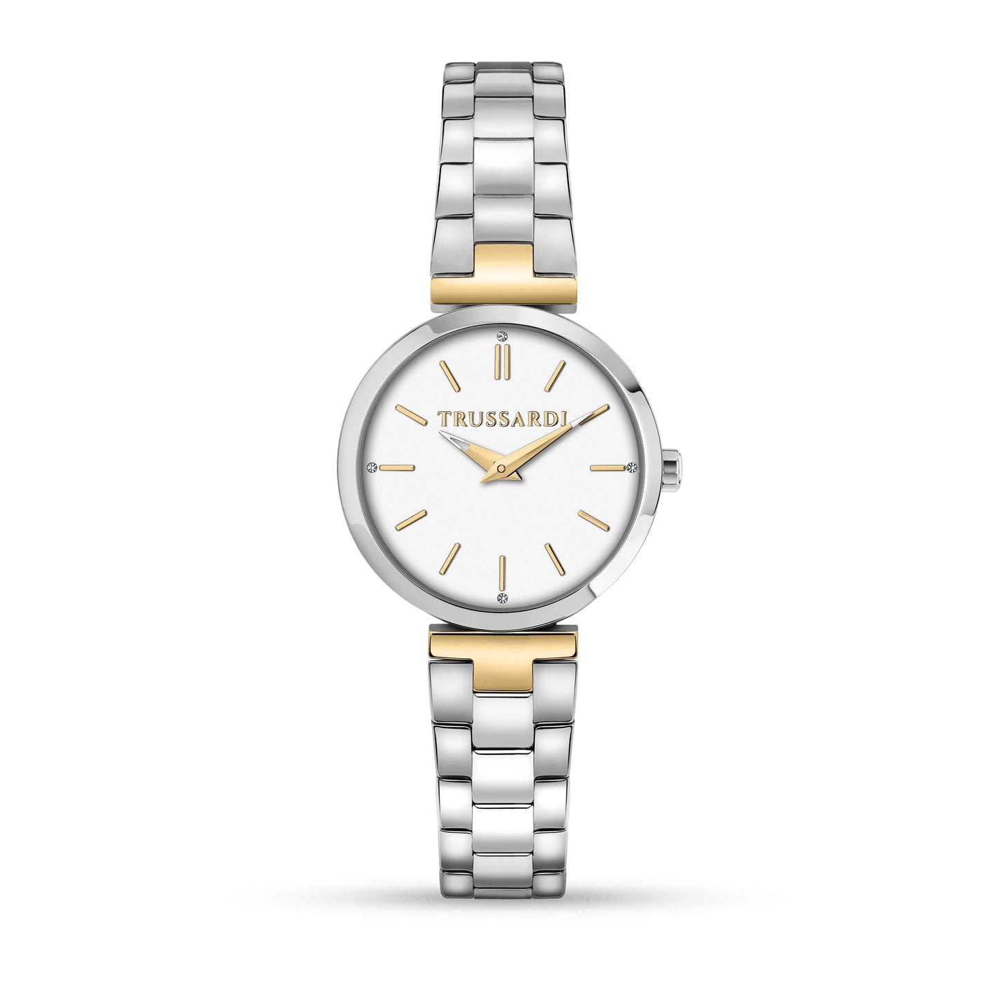 Orologio Donna TRUSSARDI della collezione LOUD. Orologio con movimento MVT. M2025, funzione Solo tempo. 2H. Quadrante: 2 lancette UPMR, finitura Acciaio. lucido, colore BIANCO. OPACO. Tipo cinturino: Ribordato vero. Materiale cinturino: Bracciale in Metallo di colore Acciaio. Cassa in Vetro minerale di dimensioni 30. Chiusura: Fibbia da sub con pulsanti. Resistenza all'acqua: 5 ATM. Peso: 65 gr. Codice prodotto: R2453164502. Colore: ARGENTO. Materiali: Acciaio. Confezione: scatola originale TRUSSARDI. Garanzia: garanzia internazionale TRUSSARDI