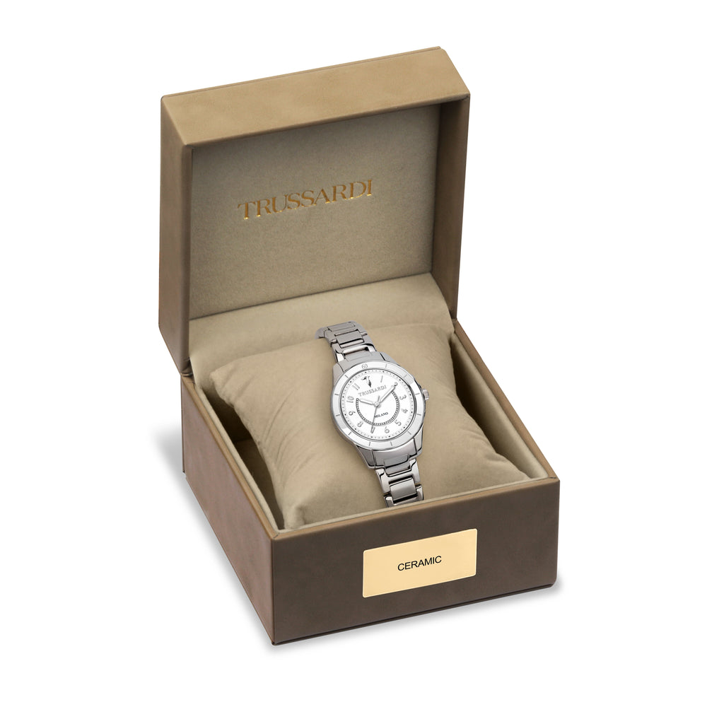 Orologio Donna TRUSSARDI della collezione T-SKY. Orologio con movimento MVT VJ21, funzione Solo tempo. 3H. Quadrante: 3 lancette UPMR num arabi, finitura Acciaio. lucido, colore BIANCO. Tipo cinturino: Solid. Materiale cinturino: Bracciale in Metallo di colore Acciaio. Cassa in Vetro minerale di dimensioni 30. Chiusura: Fibbia DEPLOYANTE con pulsanti. Resistenza all'acqua: 5 ATM. Peso: 68,5 gr. Codice prodotto: R2453151502. Materiali: Acciaio. Confezione: scatola originale TRUSSARDI. Garanzia: garanzia internazionale TRUSSARDI