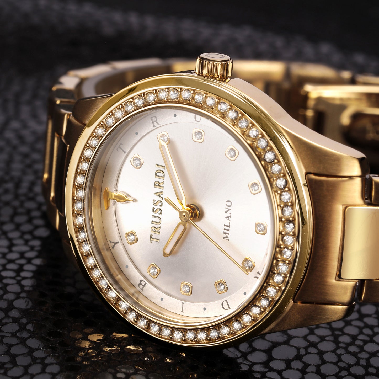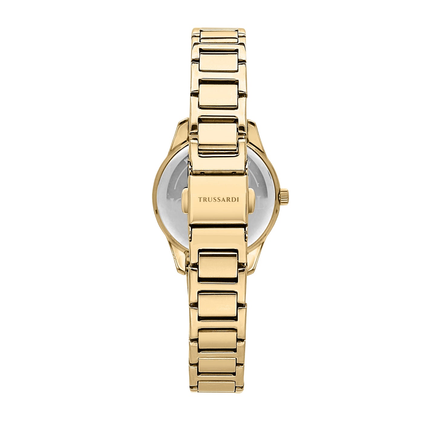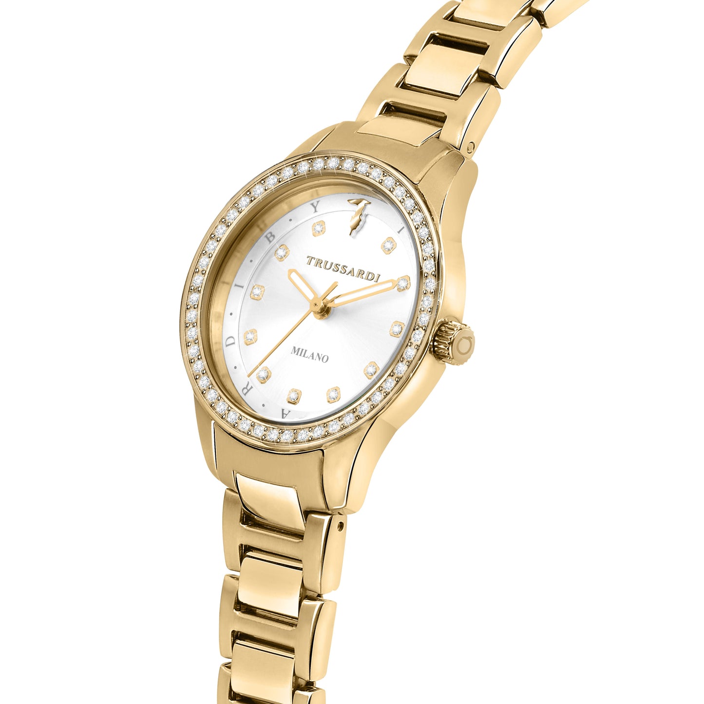 Orologio Donna TRUSSARDI della collezione T-SKY. Orologio con movimento MVT VJ21, funzione Solo tempo. 3H. Quadrante: 3 lancette indice di cristallo, finitura Acciaio. lucido, colore BIANCO. Tipo cinturino: Solid. Materiale cinturino: Bracciale in Metallo di colore Oro. Cassa in Vetro minerale di dimensioni 30. Chiusura: Fibbia DEPLOYANTE con pulsanti. Resistenza all'acqua: 5 ATM. Peso: 68,5 gr. Codice prodotto: R2453151504. Materiali: Acciaio. PVD Oro. Pietra. Confezione: scatola originale TRUSSARDI. Garanzia: garanzia internazionale TRUSSARDI