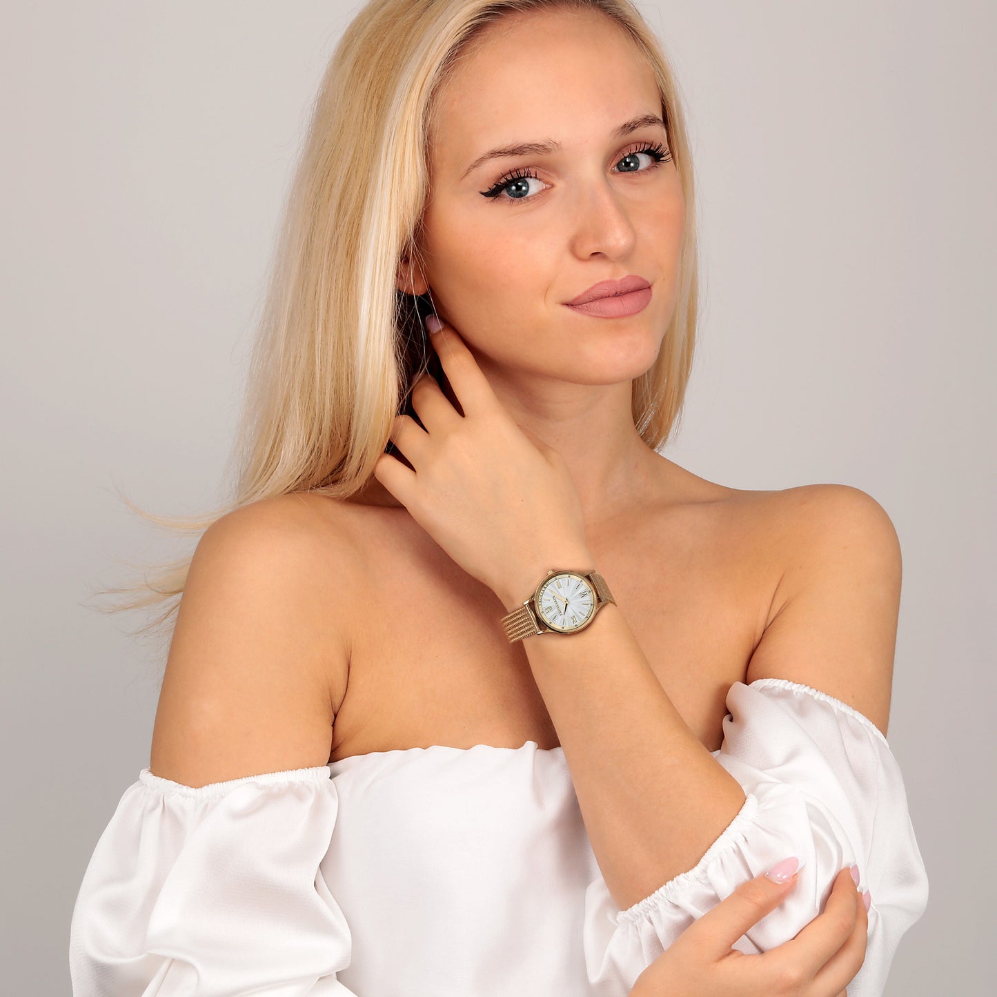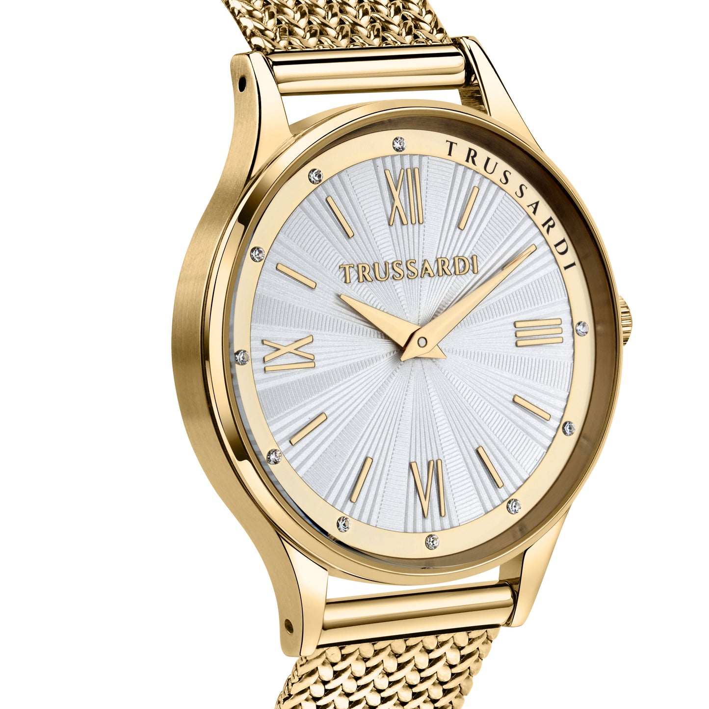 Orologio Donna TRUSSARDI della collezione T-STAR. Orologio con movimento MVT.GL24, funzione Solo tempo. 2H. Quadrante: 2 lancette UPMR indici e indici di pietra, finitura acciaio spazzolato e raffinato, colore BIANCO. Tipo cinturino: Mesh Band. Materiale cinturino: Bracciale in Metallo di colore Oro. Cassa in Vetro minerale di dimensioni 34. Chiusura: Clip e gancio. Resistenza all'acqua: 5 ATM. Peso: 64,6 gr. Codice prodotto: R2453152502. Materiali: Acciaio. PVD Oro. Confezione: scatola originale TRUSSARDI. Garanzia: garanzia internazionale TRUSSARDI