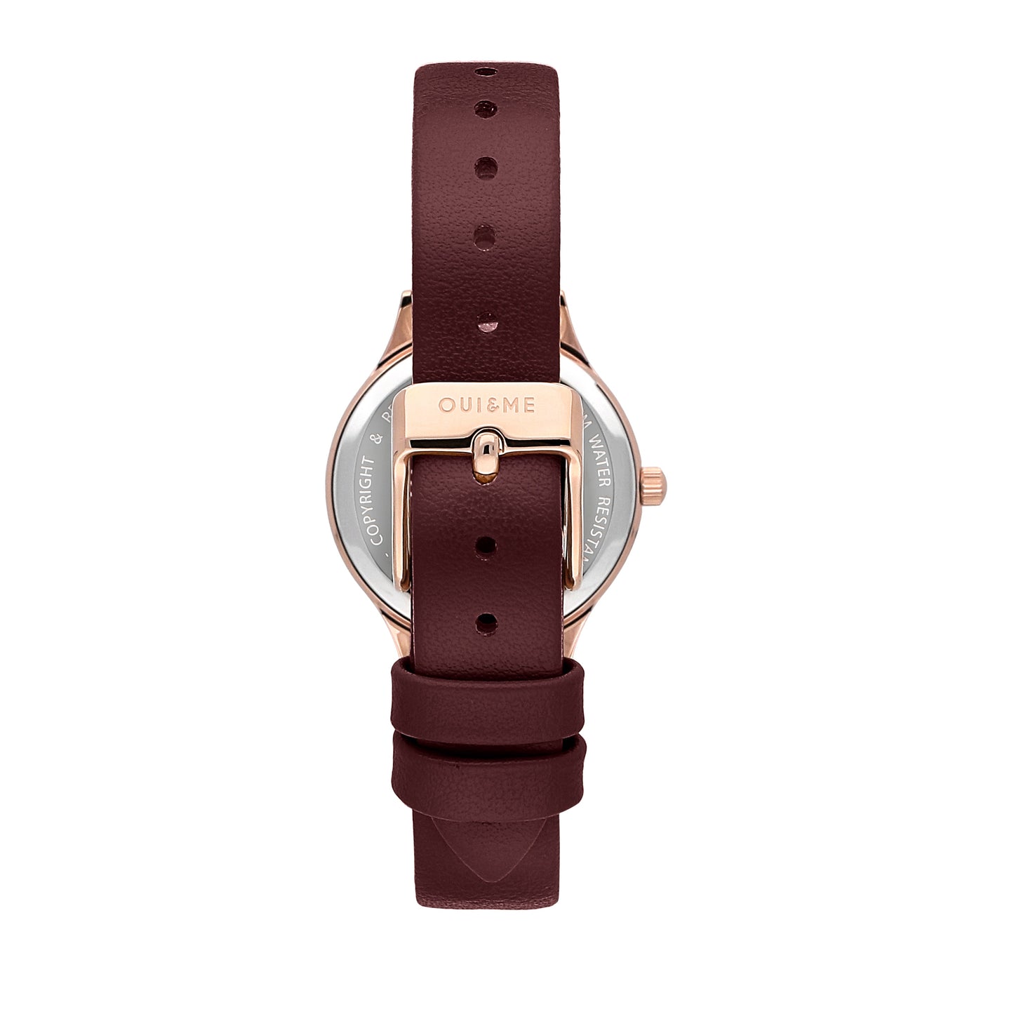 Orologio da donna Oui & Me, Collezione Minette, ref. ME010170, analogico, movimento al quarzo, solo tempo, in acciaio, pvd oro rosa, cuoio. L'orologio è caratterizzato da un cinturino intercambiabile in cuoio, con fibbia. La cassa, diametro 28mm, fa da cornice ad un raffinato quadrante burgundy sunray, con vetro minerale. Resistenza all'acqua fino a 5 ATM. Confezione: Scatola Originale Oui&Me. Garanzia: Garanzia Internazionale Oui&Me.