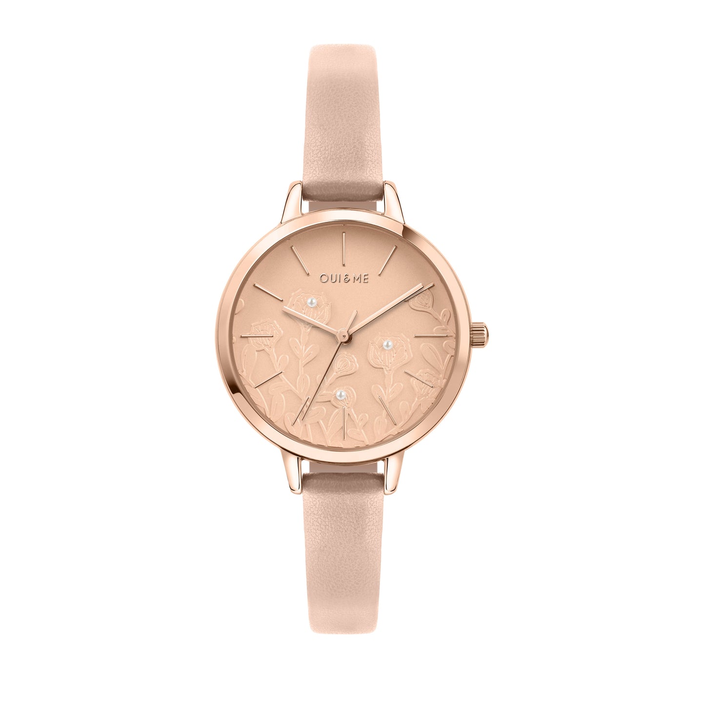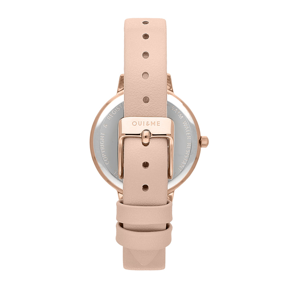 OROLOGIO OUI&ME FLEURETTE ME010129. Orologio solo tempo da donna di Oui&Me della collezione petite fleurette. Orologio con cassa in acciaio con trattamento in pvd oro rosa e pelle naturale della dimensione di 32x39,4mm. Cinturino in pelle color carne. Quadrante di colore oro rosa brillante con vetro minerale. Chiusura: fibbia ardiglione. Resistenza all'acqua: 5 atm. Confezione: Scatola Originale Oui&Me. Garanzia: Garanzia Internazionale Oui&Me.