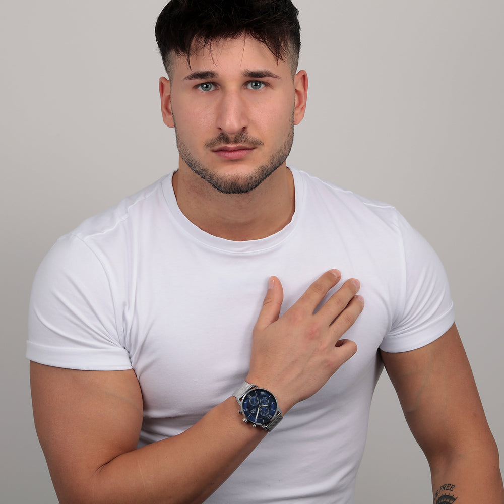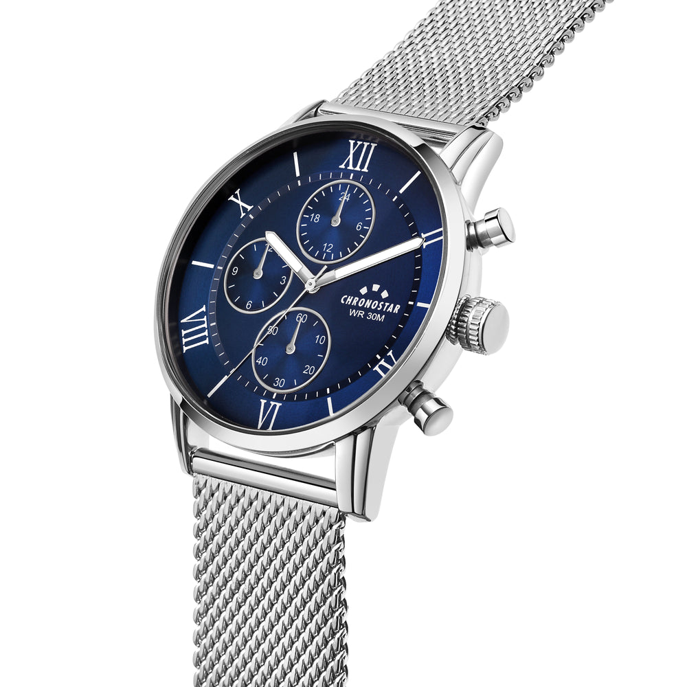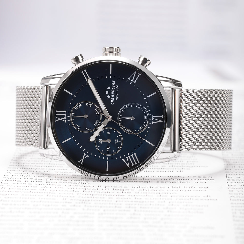 Orologio Uomo CHRONOSTAR della collezione NOBLE. Orologio con movimento MVT VD38A1, funzione Multifunzione. Quadrante: Multifunzione 3 contattori, finitura Lega. Lucido, colore BLU. Tipo cinturino: Mesh Band. Materiale cinturino: Bracciale in Metallo di colore Acciaio. Cassa in Vetro minerale di dimensioni 43. Chiusura: Clip e gancio. Resistenza all'acqua: 3 ATM. Peso: 80 gr. Codice prodotto: R3753306001. Colore: ARGENTO. Materiali: Lega + PVD argento. acciaio. Confezione: scatola originale CHRONOSTAR. Garanzia: garanzia internazionale CHRONOSTAR