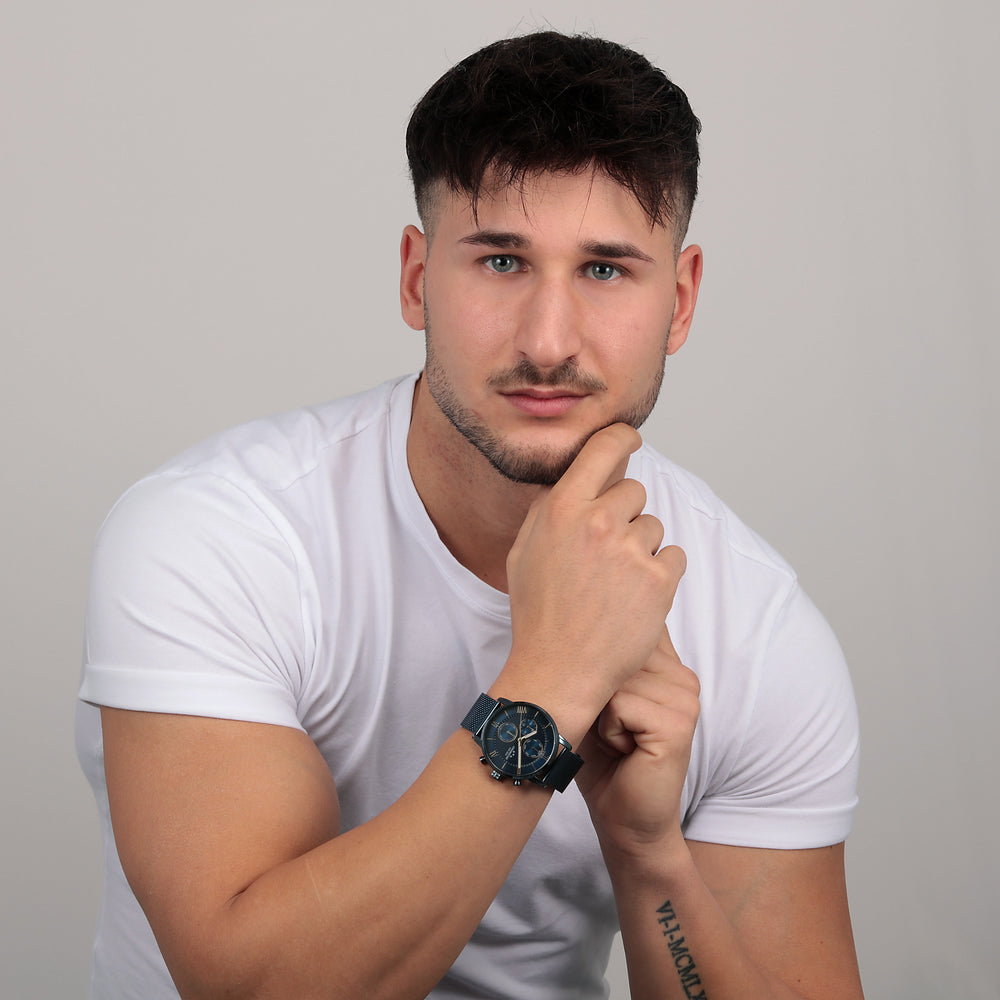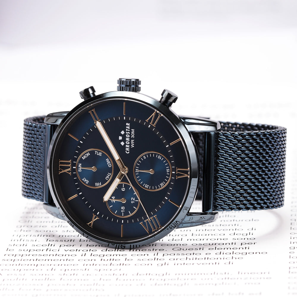Orologio Uomo CHRONOSTAR della collezione NOBLE. Orologio con movimento MVT VD38A1, funzione Multifunzione. Quadrante: Multifunzione 3 contattori, finitura Lega. Lucido, colore BLU. Tipo cinturino: Mesh Band. Materiale cinturino: Bracciale in Metallo di colore Blu. Cassa in Vetro minerale di dimensioni 43. Chiusura: Clip e gancio. Resistenza all'acqua: 3 ATM. Peso: 80 gr. Codice prodotto: R3753306003. Colore: BLU. Materiali: Lega.Acciaio.PVD BLU. Confezione: scatola originale CHRONOSTAR. Garanzia: garanzia internazionale CHRONOSTAR