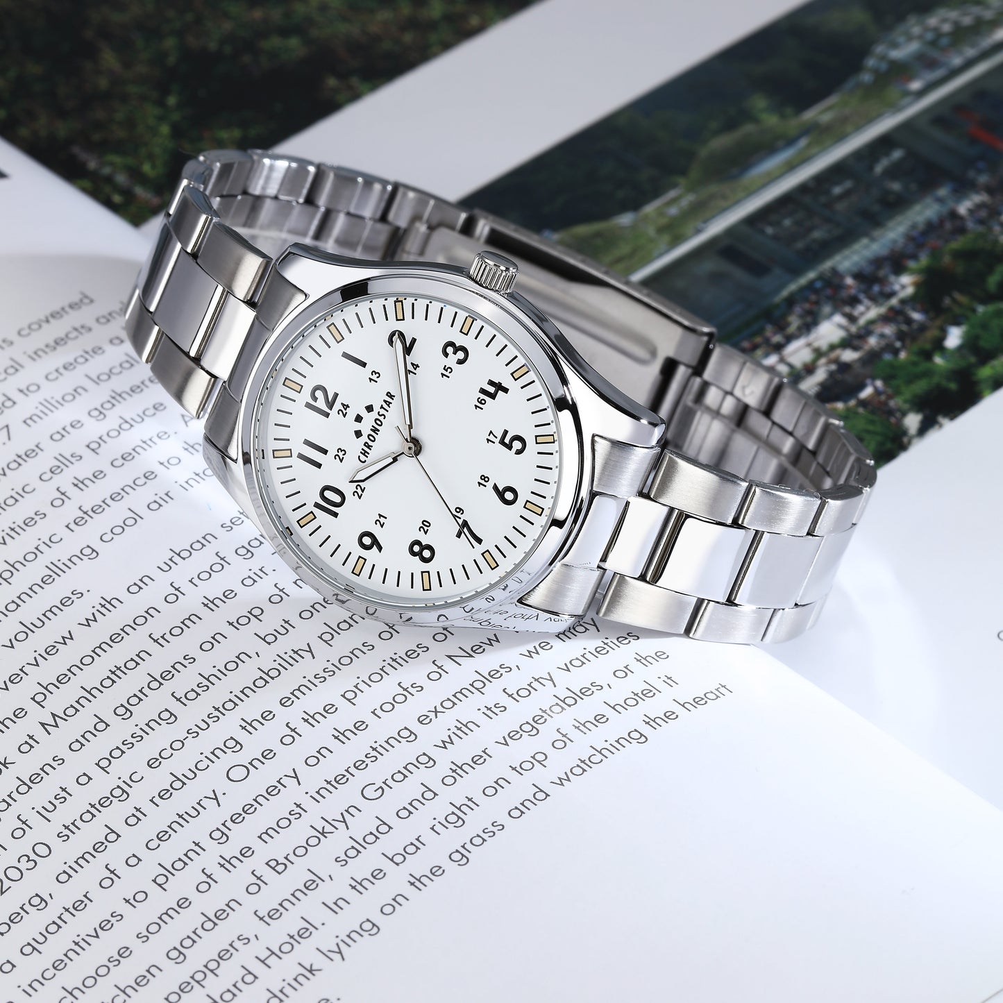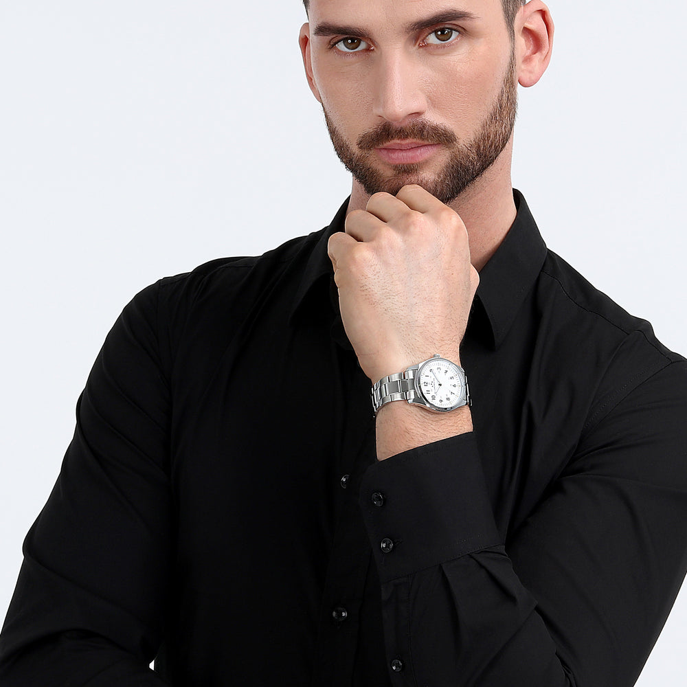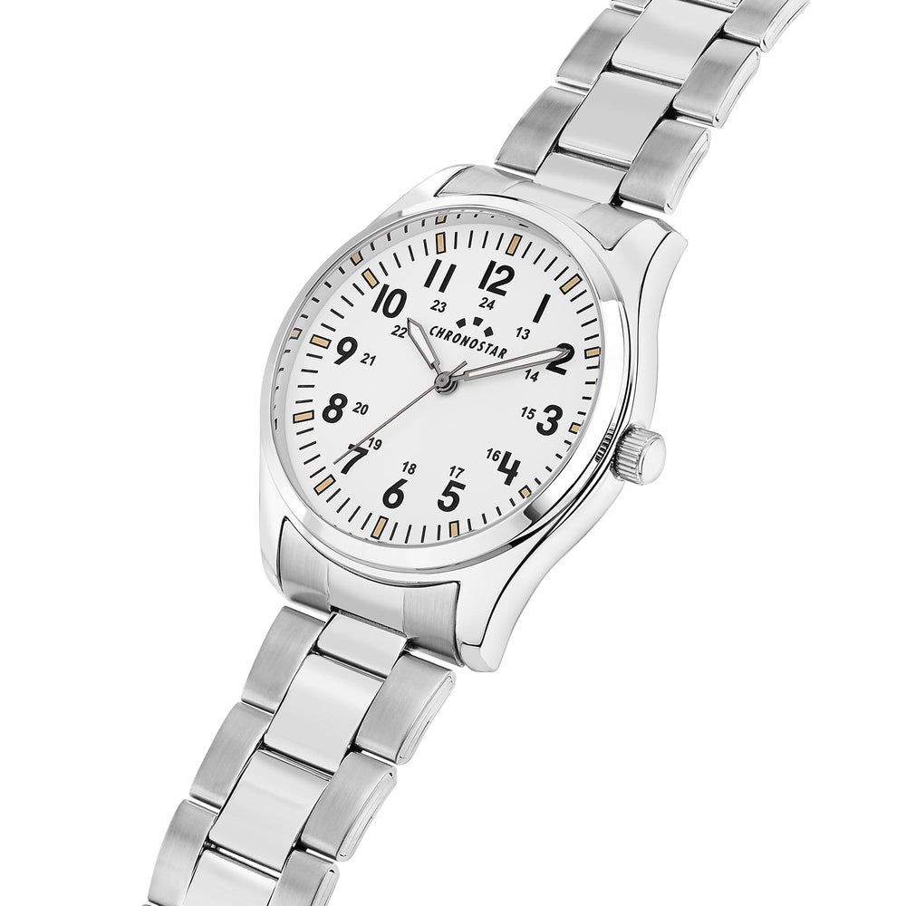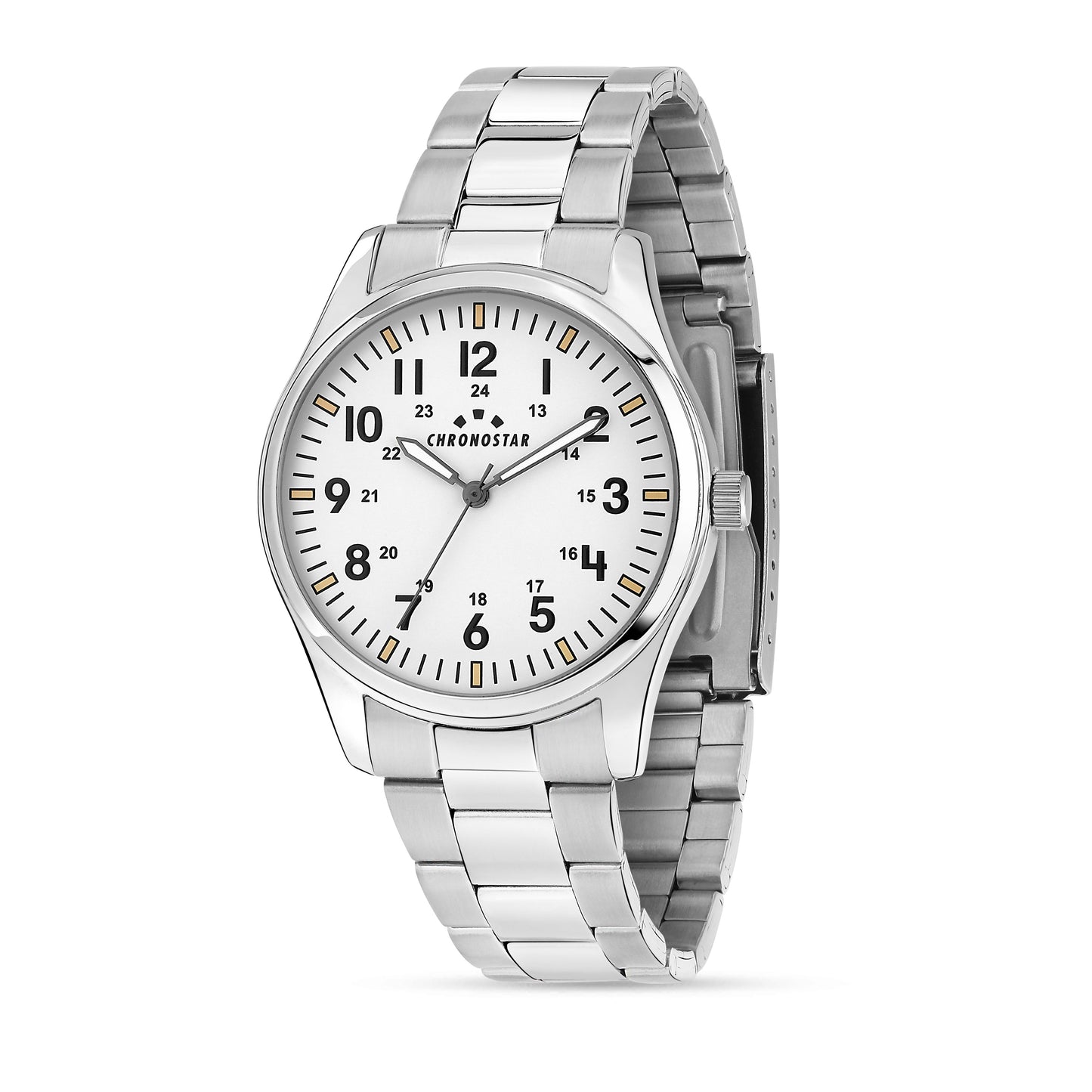 Orologio Uomo CHRONOSTAR della collezione PILOT. Orologio con movimento MVT. M2035, funzione Solo tempo. 3H. Quadrante: 3 lancette arabi stampato, finitura acciaio, colore BIANCO OPACO. Materiale cinturino: Acciaio di colore Acciaio. Cassa in Vetro minerale di dimensioni 39. Chiusura: Fibbia DIVER. Resistenza all'acqua: 3 ATM. Peso: 93 gr. Codice prodotto: R3753313001. Colore: ARGENTO. Materiali: Acciaio. Lega. Confezione: scatola originale CHRONOSTAR. Garanzia: garanzia internazionale CHRONOSTAR