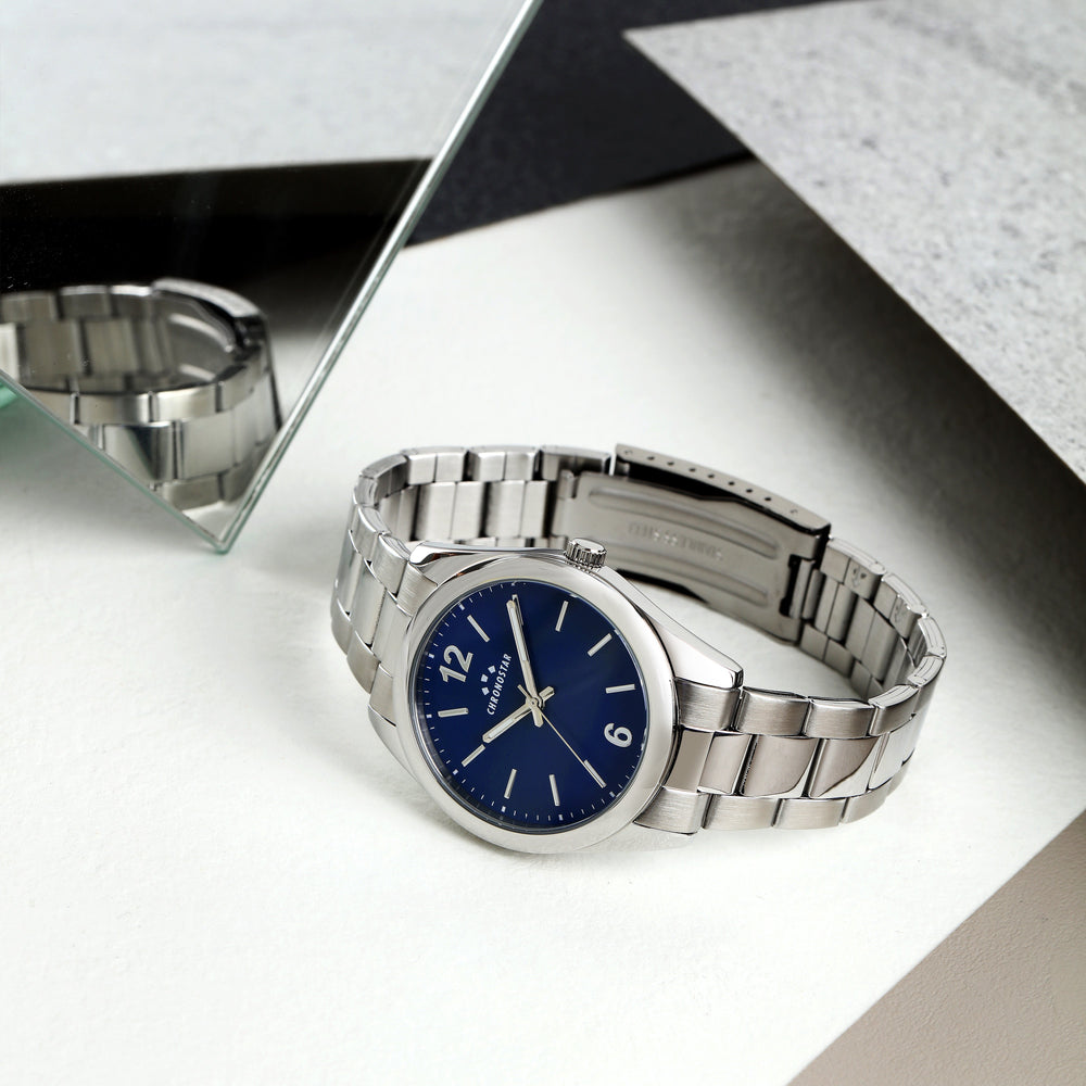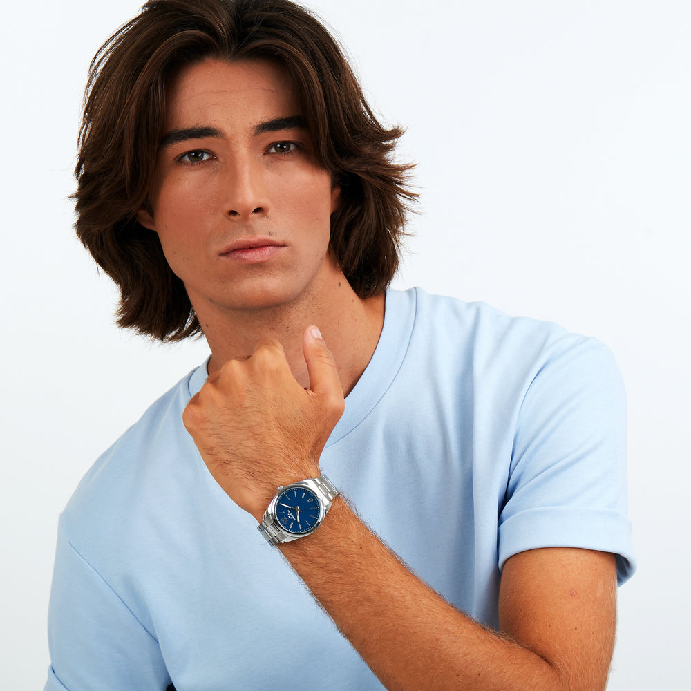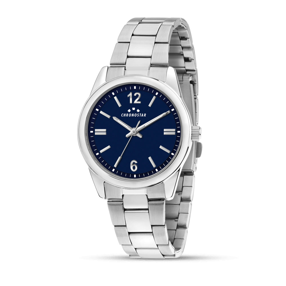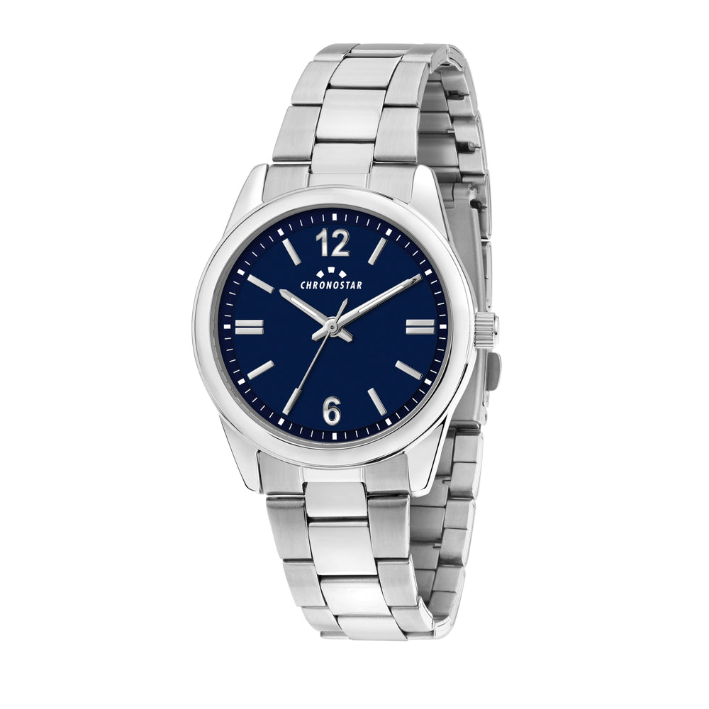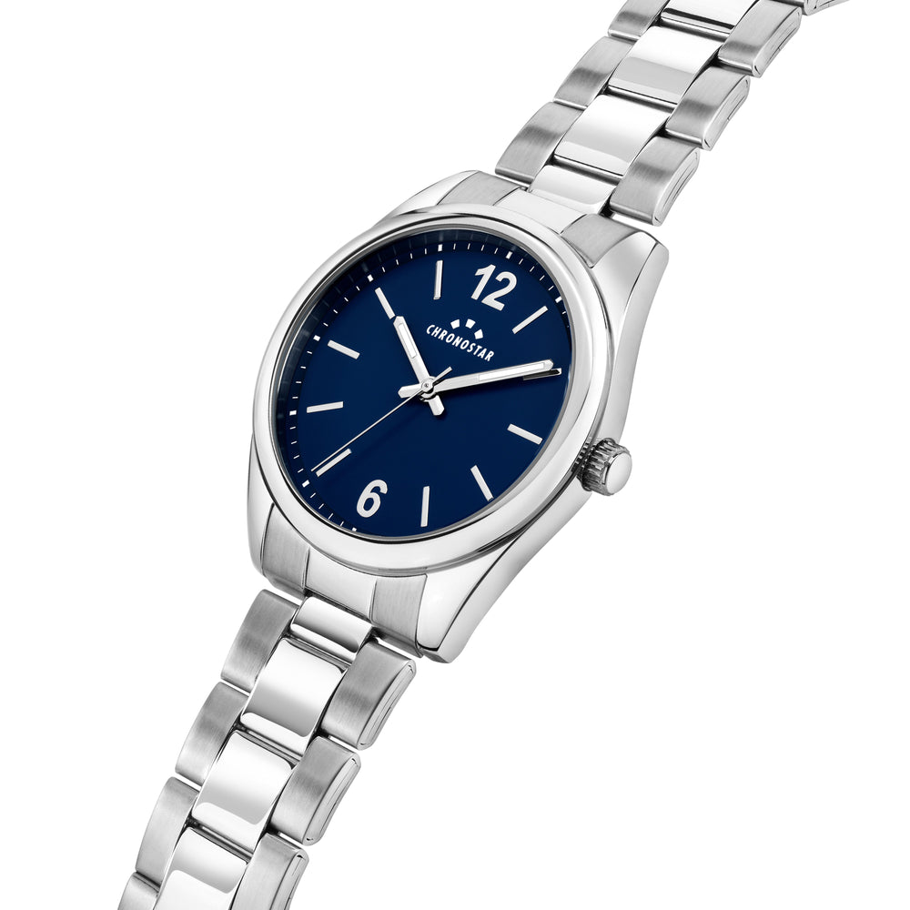 Orologio Uomo CHRONOSTAR della collezione TIMELESS. Orologio con movimento MVT. M2035, funzione Solo tempo. 3H. Quadrante: 3 lancette UPMR arabi a ore 6-12. altri indici UPR, finitura Acciaio. lucido, colore BLU. OPACO. Tipo cinturino: Ribordato vero. Materiale cinturino: Bracciale in Metallo di colore Acciaio. Cassa in Vetro minerale di dimensioni 39. Chiusura: Fibbia DIVER. Resistenza all'acqua: 3 ATM. Peso: 99 gr. Codice prodotto: R3753316004. Colore: ARGENTO. Materiali: Acciaio. Confezione: scatola originale CHRONOSTAR. Garanzia: garanzia internazionale CHRONOSTAR