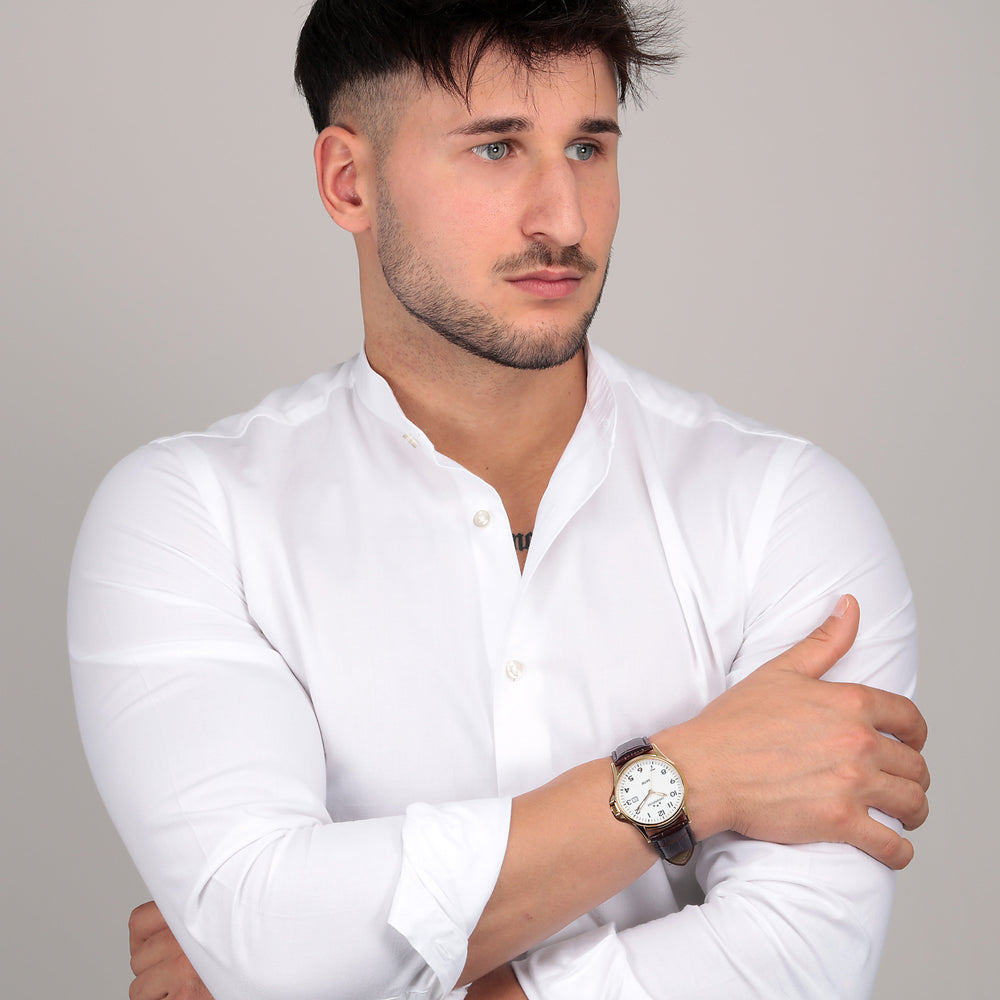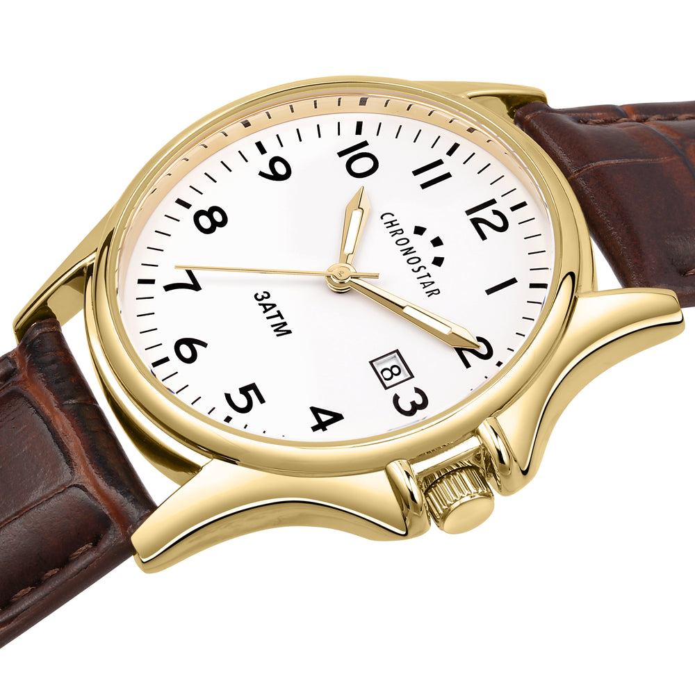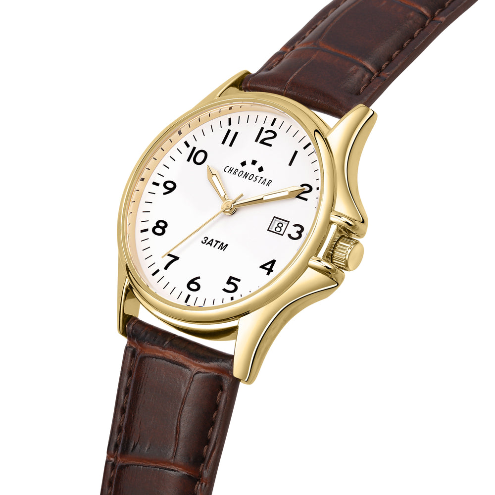 Orologio Uomo CHRONOSTAR della collezione VINTAGE. Orologio con movimento MVT. MIYOTA 2115, funzione tempo e data. Quadrante: 3 lancette Print arabia, finitura Lega. Lucido, colore BIANCO. Tipo cinturino: Tranciato. Materiale cinturino: Sintetico di colore Marrone. Cassa in Vetro minerale di dimensioni 43. Chiusura: Fibbia ARDIGLIONE. Resistenza all'acqua: 3 ATM. Peso: 50 gr. Codice prodotto: R3751121003. Materiali: Lega. PVD Argento. Pelle naturale. Confezione: scatola originale CHRONOSTAR. Garanzia: garanzia internazionale CHRONOSTAR