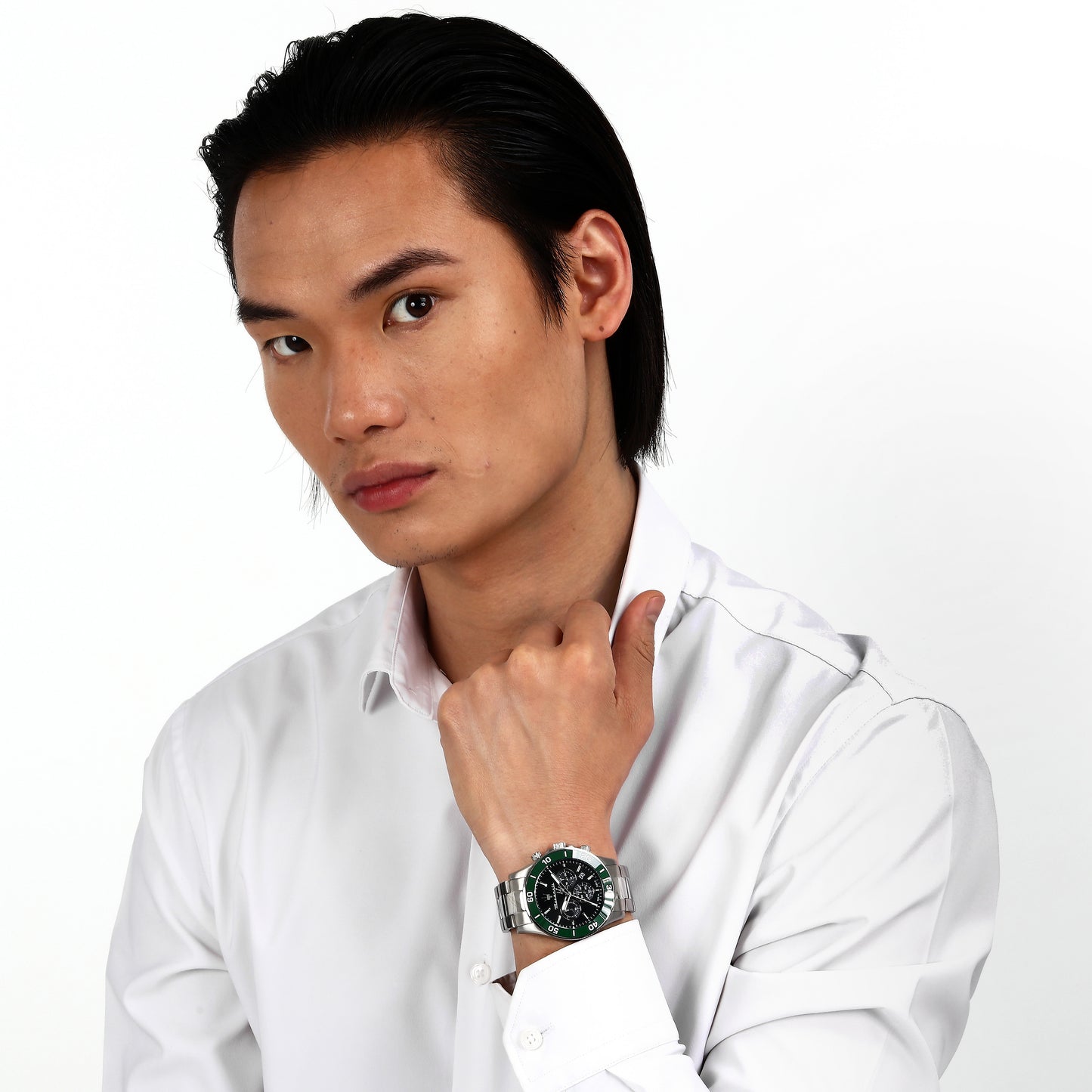 Orologio Uomo Maserati Competizione R8873600008. Orologio da uomo con movimento al quarzo Miyota JS25 e funzioni di cronografo con data. Cassa in acciaio inox dal diametro di 43 mm. Lunetta in ceramica verde. Quadrante analogico nero con indici a bastoni, logo a ore 12 e datario tra le ore 4 e 5. Fondello e corona a vite per garantire maggiore impermeabilità. Cinturino in acciaio anallergico; chiusura deployante con pulsanti. Resistente all'acqua fino a 100 metri di profondità. Confezione: scatola originale Maserati. Prodotto con garanzia internazionale Maserati.