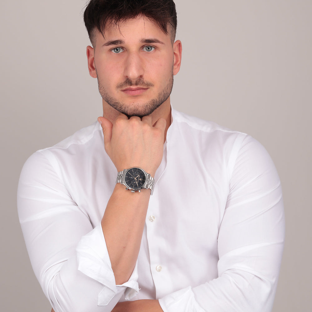 Orologio Uomo Maserati Epoca R8873618017. Orologio Maserati da uomo con movimento al quarzo Miyota JS20 e funzioni di cronografo con data. Cassa in acciaio inox dal diametro di 42 mm. Quadrante analogico nero con indici a bastoni e lancette gold e logo nella parte alta. Cinturino in acciaio anallergico silver; chiusura deployante con pulsanti. Resistente all'acqua fino a 100 metri di profondità. Scatola originale Maserati. Garanzia: garanzia internazionale Maserati.