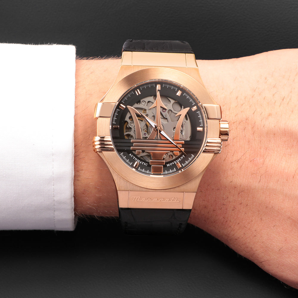 OROLOGIO UOMO MASERATI POTENZA R8821108017. Orologio Automatico con movimento MVT.SEAGULL TY2809. La cassa dell'orologio misura 42,00 mm, con uno spessore di 13,30 mm. Il quadrante nero scheletrato è composto da elementi in oro rosa a forma di tridente, logo del marchio. È costituito da un cristallo minerale. Cinturino in pelle di colore nero. Resistenza all'acqua fino a 10 ATM. Confezione: scatola originale MASERATI. Garanzia: garanzia internazionale MASERATI.