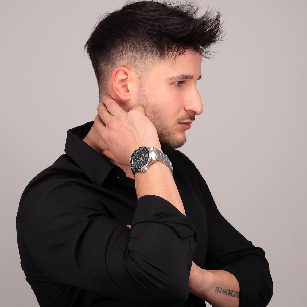 OROLOGIO UOMO MASERATI SFIDA R8853140005. Orologio con movimento MVT 515.24H DATE H3 AIG.1 (FAR EAST), funzione GMT. Quadrante: 4 lancette UPMR c/datario a ore 3, finitura Satinato, colore NERO. Tipo cinturino: Semi-Solid. Materiale cinturino: Bracciale in Metallo di colore Acciaio. Cassa in Vetro minerale di dimensioni 44. Chiusura: Fibbia DEPLOYANTE con pulsanti. Resistenza all'acqua: 10 ATM. Peso: 102,5 gr. Codice prodotto: R8853140005. Colore: ARGENTO. Materiali: Acciaio. Confezione: scatola originale MASERATI. Garanzia: garanzia internazionale MASERATI