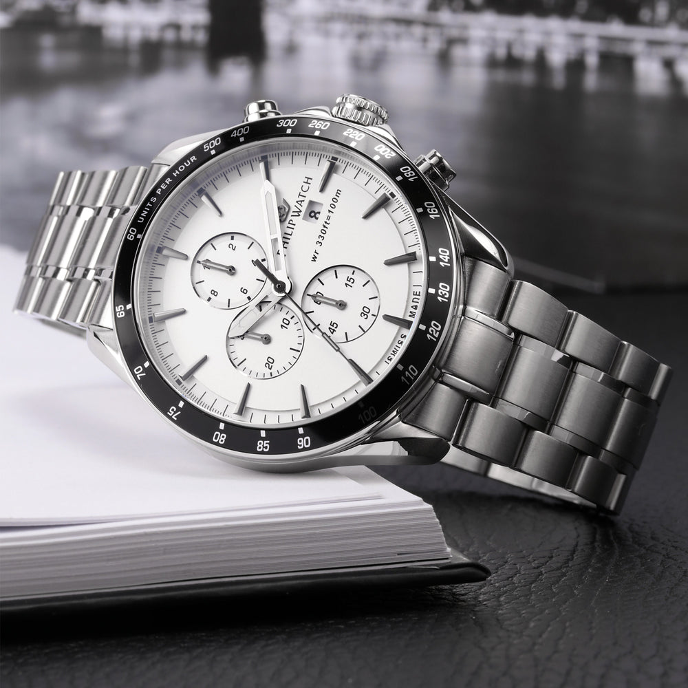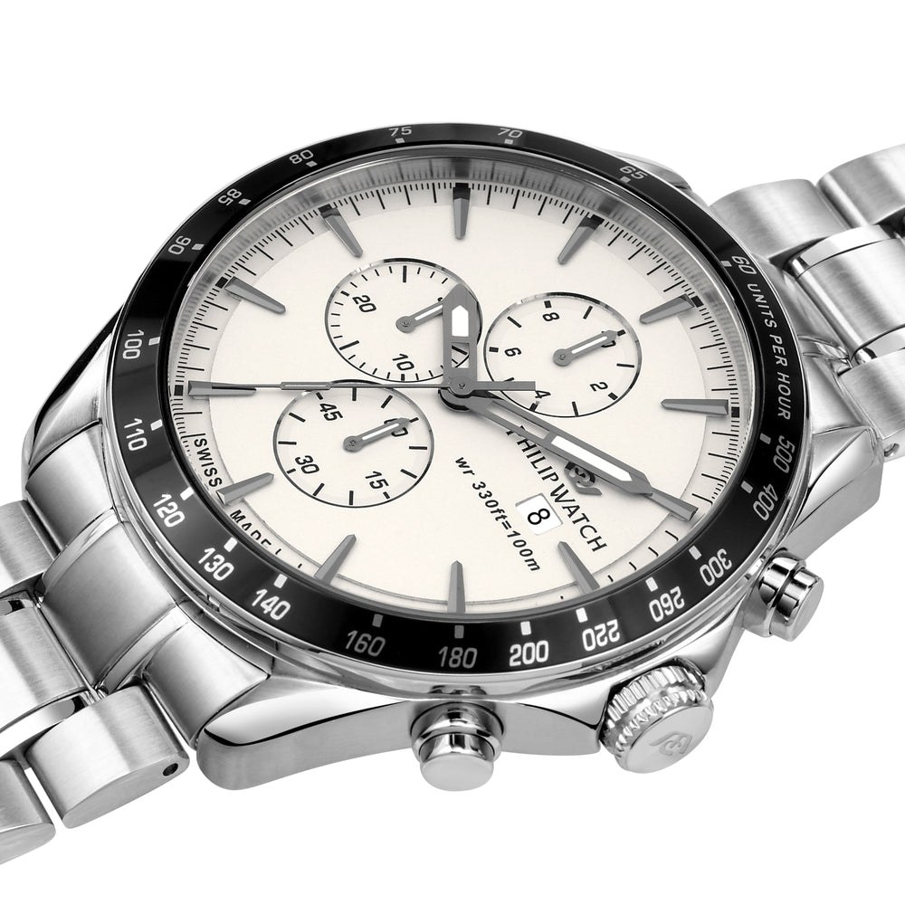 Orologio Uomo Philip Watch Blaze R8273995009. Orologio da Uomo Philip Watch della collezione BLAZE con movimento al quarzo Ronda 3540, funzione Cronografo. Quadrante: BIANCO. Materiale cinturino: Bracciale in Metallo di colore Argento. Cassa in acciaio di dimensioni 44mm con vetro zaffiro trattamento antiriflesso. Chiusura: Fibbia a farfalla con pulsanti di sicurezza. Resistenza all'acqua: 10 ATM. Confezione: scatola originale PHILIP WATCH. Garanzia: garanzia internazionale PHILIP WATCH.