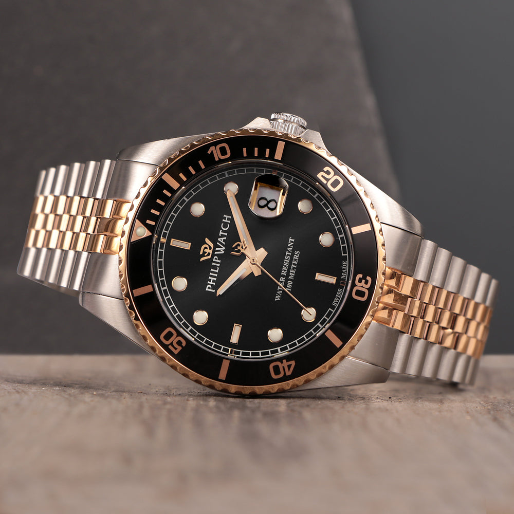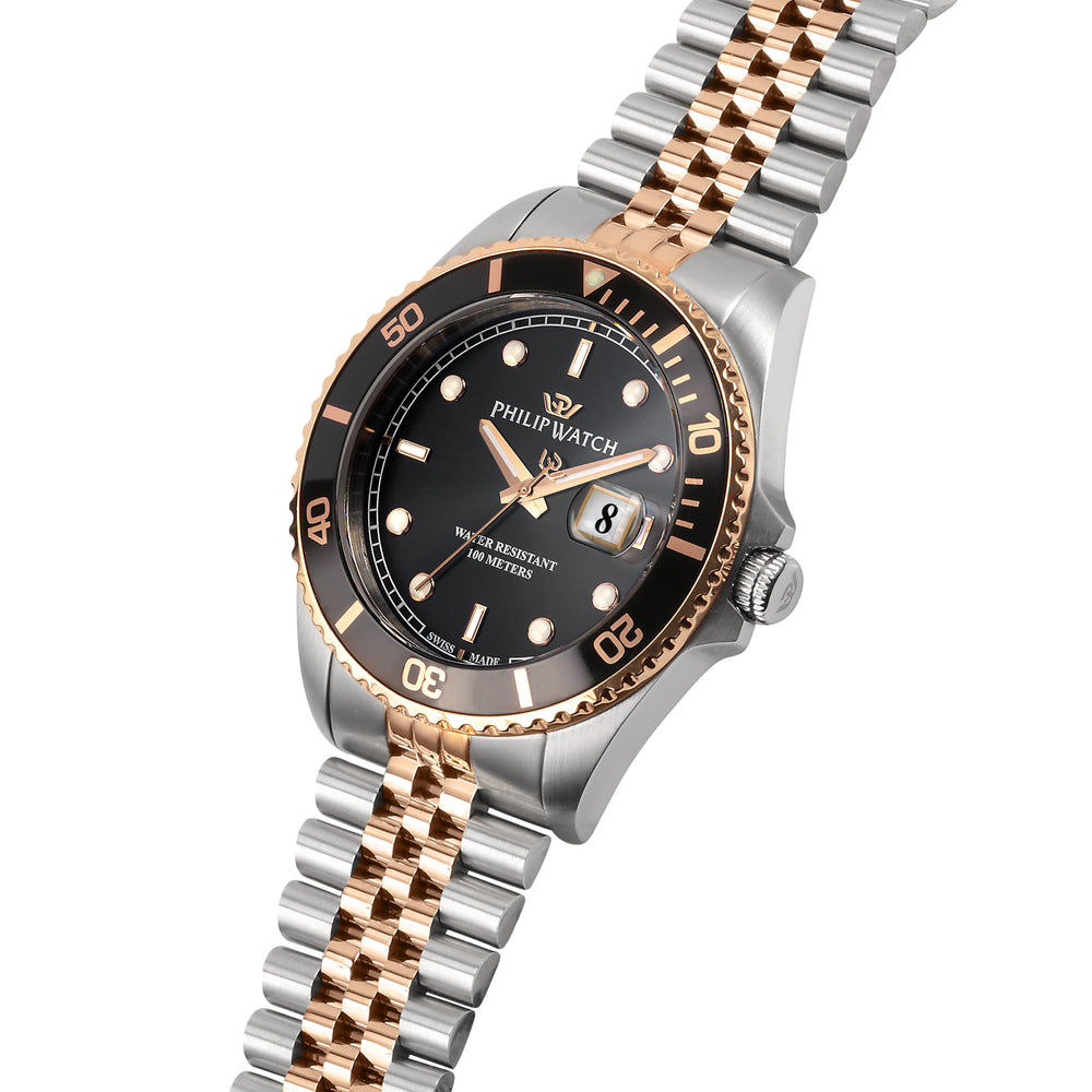 Orologio Uomo PHILIP WATCH della collezione CARIBE SPORT. Orologio con movimento MOV ETA F06.115, funzione tempo e data. Quadrante: 3 lancette indici c/datario a ore 3, finitura Lucido e satinato, colore NERO. Tipo cinturino: Solid. Materiale cinturino: Bracciale in Metallo di colore Oro Rosa. Acciaio. Cassa in Vetro zaffiro di dimensioni 42. Chiusura: Fibbia Diver c/pulsanti e blocco di sicurezza. Resistenza all'acqua: 10 ATM. Peso: 150,57 gr. Codice prodotto: R8253597081. Materiali: Acciaio. PVD Oro rosa. Confezione: scatola originale PHILIP WATCH. Garanzia: garanzia internazionale PHILIP WATCH