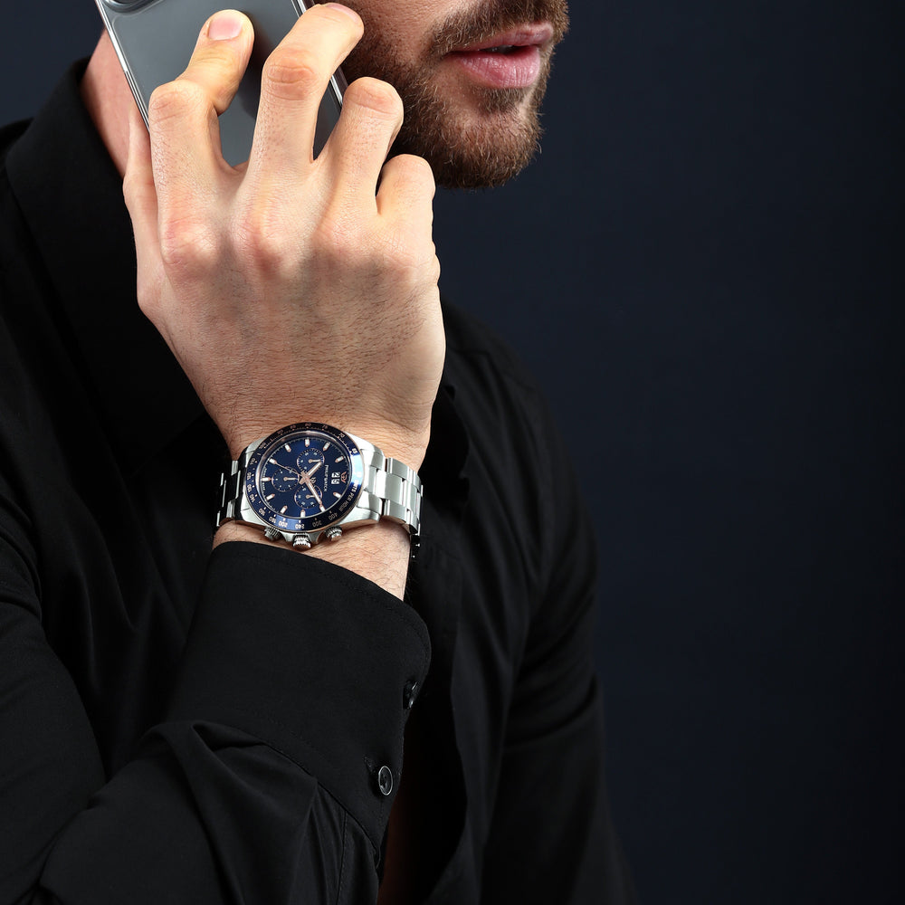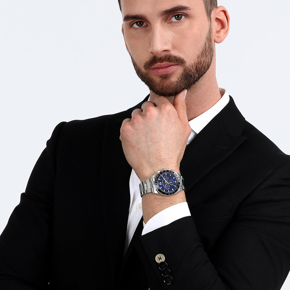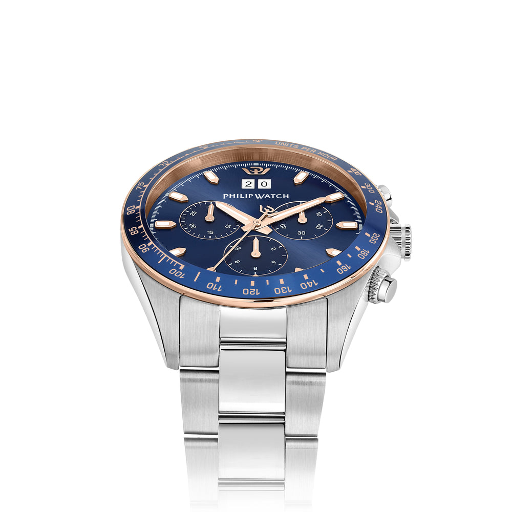 Orologio Uomo Philip Watch Caribe Sport R8273607008. Orologio Philip Watch da uomo con movimento al quarzo RONDA 5040 e funzione di cronografo con data. Cassa in acciaio inox dal diametro di 42 mm. Lunetta con inserto in alluminio blu. Fondello e corona a vite per garantire maggiore impermeabilità. Quadrante analogico blu con indici a bastoni rose gold, logo a ore 12 e datario a ore 12. Vetro zaffiro. Cinturino in acciaio anallergico; chiusura deployante con pulsanti. Resistente all'acqua fino a 100 metri di profondità. Confezione: scatola originale PHILIP WATCH. Garanzia: garanzia internazionale PHILIP WATCH.