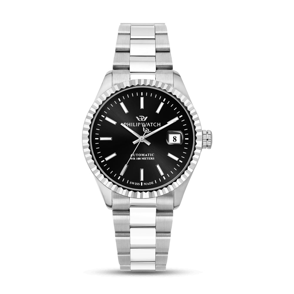 Orologio Uomo Philip Watch Caribe Urban R8223597029. Orologio Philip Watch da uomo con movimento automatico Sellita SW200-1 e funzioni di solo tempo con data. Cassa in acciaio inox dal diametro di 39 mm. Ghiera zigrinata. Quadrante nero con indici a bastoni e datario a ore 3. Corona a vite per una maggiore impermeabilità. Vetro zaffiro antigraffio. Cinturino in acciaio anallergico; chiusura deployante con pulsanti. Confezione: scatola originale PHILIP WATCH. Garanzia: garanzia internazionale PHILIP WATCH.