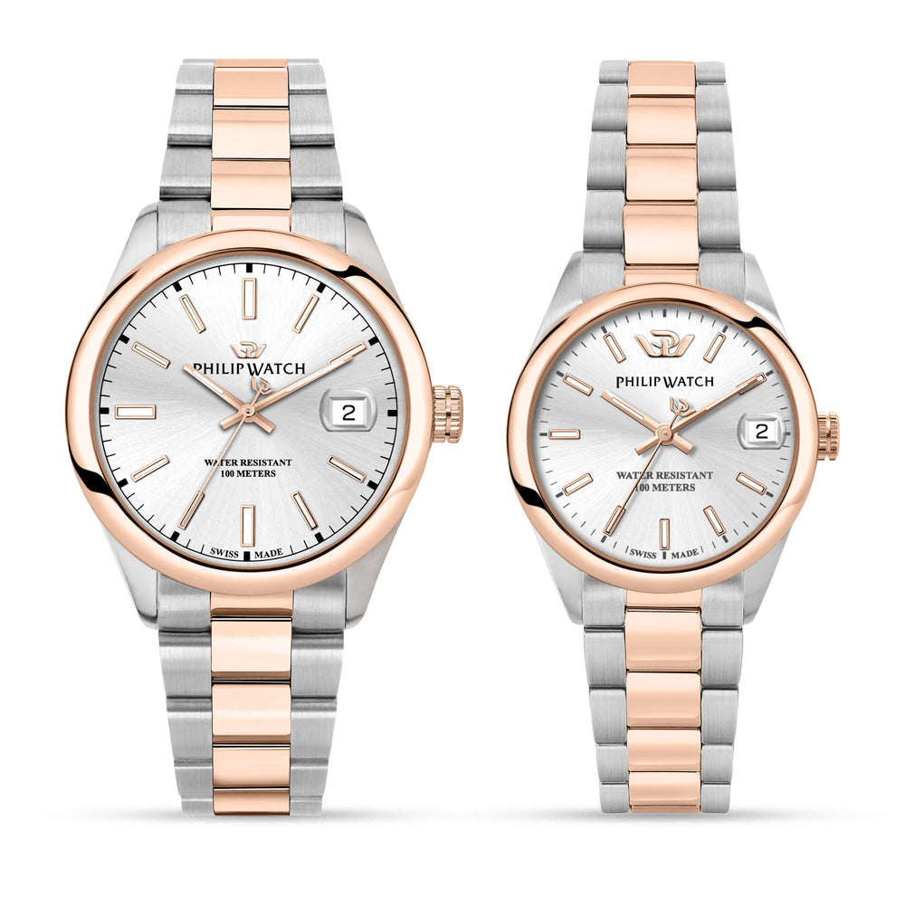 Orologi Philip Watch Caribe Urban R8253597100 - Set di orologi in coppia uomo - donna. L'orologio da uomo ha movimento al quarzo ETA F06.115 e funzione di solo tempo con data. Cassa in acciaio inox dal diametro di 39 mm. Lunetta placcata oro rosa. Fondello e corona a vite per garantire maggiore impermeabilità. Quadrante analogico sunray argentp con indici a bastoni, logo nella parte alta e datario a ore 3 con lente di ingrandimento. Vetro zaffiro. Cinturino bicolore in acciaio anallergico argento e oro rosa; chiusura deployante con pulsanti. Resistente all'acqua fino a 100 metri di profondità. L'orologio da donna ha movimento al quarzo ETA F05.115 e funzione di solo tempo con data. Cassa in acciaio inox dal diametro di 31 mm. Lunetta placcata oro rosa. Fondello e corona a vite per garantire maggiore impermeabilità. Quadrante analogico sunray argento con indici a bastoni, logo a ore 12 e datario a ore 3 con lente di ingrandimento. Vetro zaffiro. Cinturino bicolore in acciaio anallergico argento e oro rosa; chiusura deployante con pulsanti. Resistenti all'acqua fino a 100 metri di profondità. Confezione: scatola originale PHILIP WATCH. Garanzia: garanzia internazionale PHILIP WATCH.