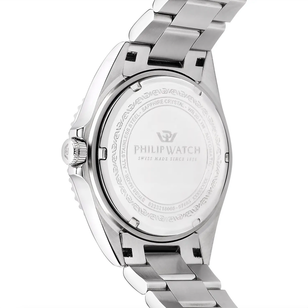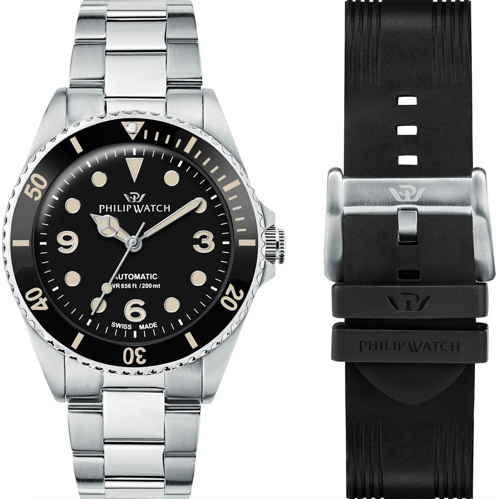 Orologio Uomo Philip Watch Caribe Diving R8223216008. Orologio da uomo con movimento automatico SELLITA SW200-01 e funzioni di solo tempo. Cassa rotonda in acciaio inox dal diametro di 42 mm. Lunetta nera girevole con inserto in ceramica. Fondello e corona a vite. Quadrante nero con indici applicati e numeri arabi a ore 3, 6, 9 e 12. Vetro zaffiro. Cinturino in acciaio anallergico color argento; chiusura deployante con pulsanti. Secondo cinturino con estensione muta in silicone nero. Resistente all'acqua fino a 200 metri di profondità. Garanzia: Ufficiale 2 anni Philip Watch, Confezione: Originale Philip Watch.