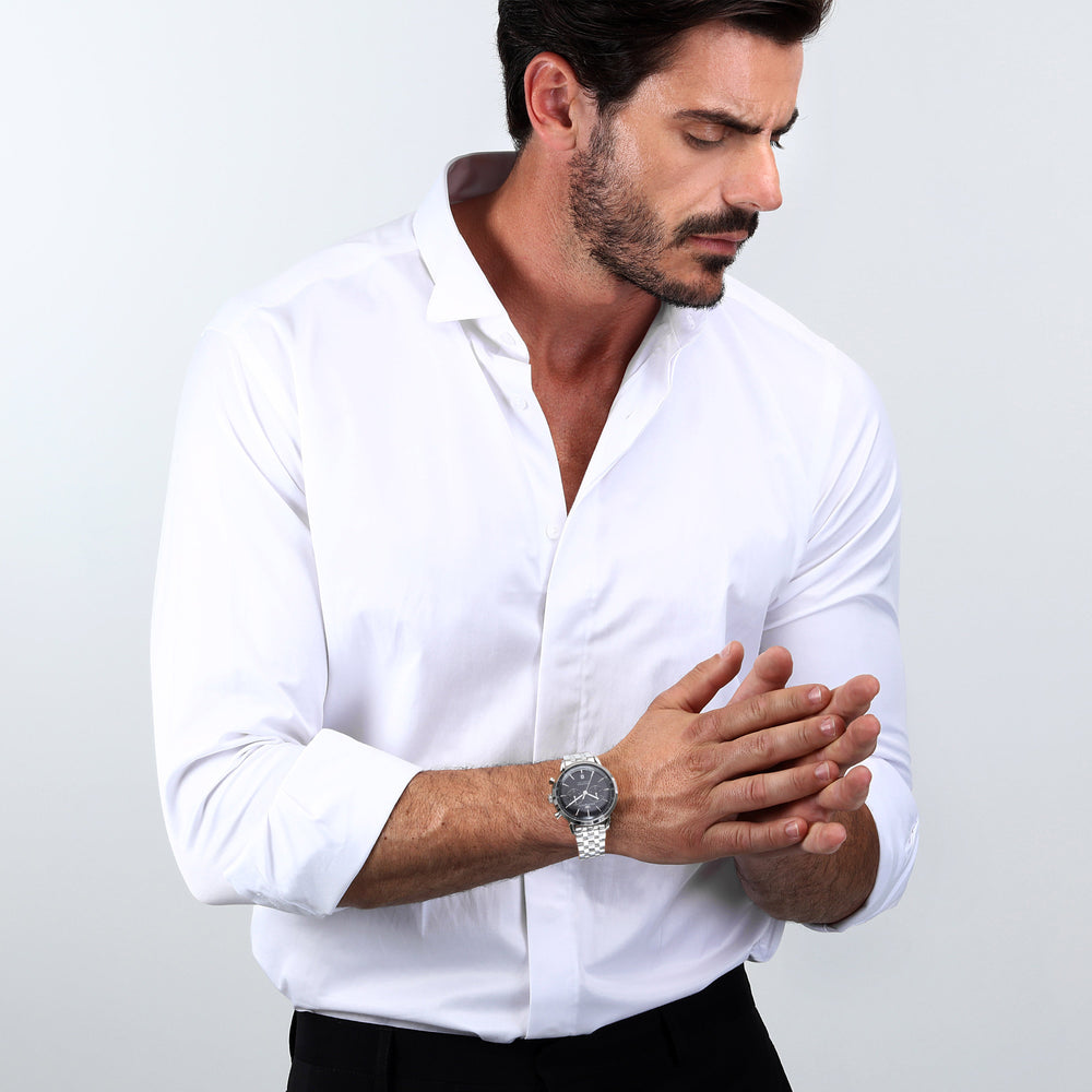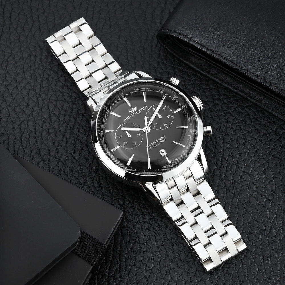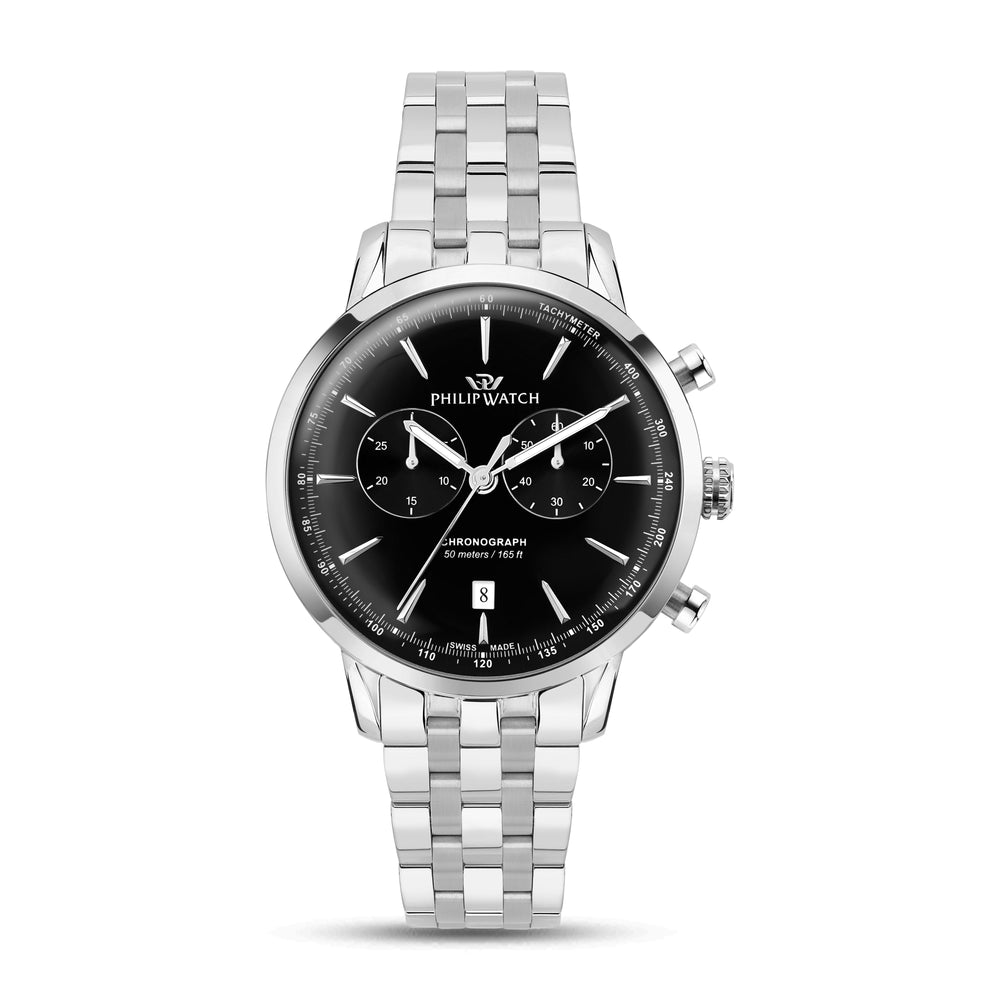 Orologio Uomo Philip Watch Sunray R8273680001. Orologio da uomo con movimento al quarzo RONDA 5021D e funzioni di cronografo con data. Cassa in acciaio inox dal diametro di 41 mm. Corona a vite per garantire una maggiore impermeabilità. Quadrante analogico nero con indici a bastoni, datario a ore 6 e logo nella parte alta. Vetro minerale a doppia curvatura. Cinturino in acciaio anallergico; chiusura deployante con pulsanti. Resistente all'acqua fino a 50 metri di profondità. Confezione: scatola originale PHILIP WATCH. Garanzia: garanzia internazionale PHILIP WATCH.