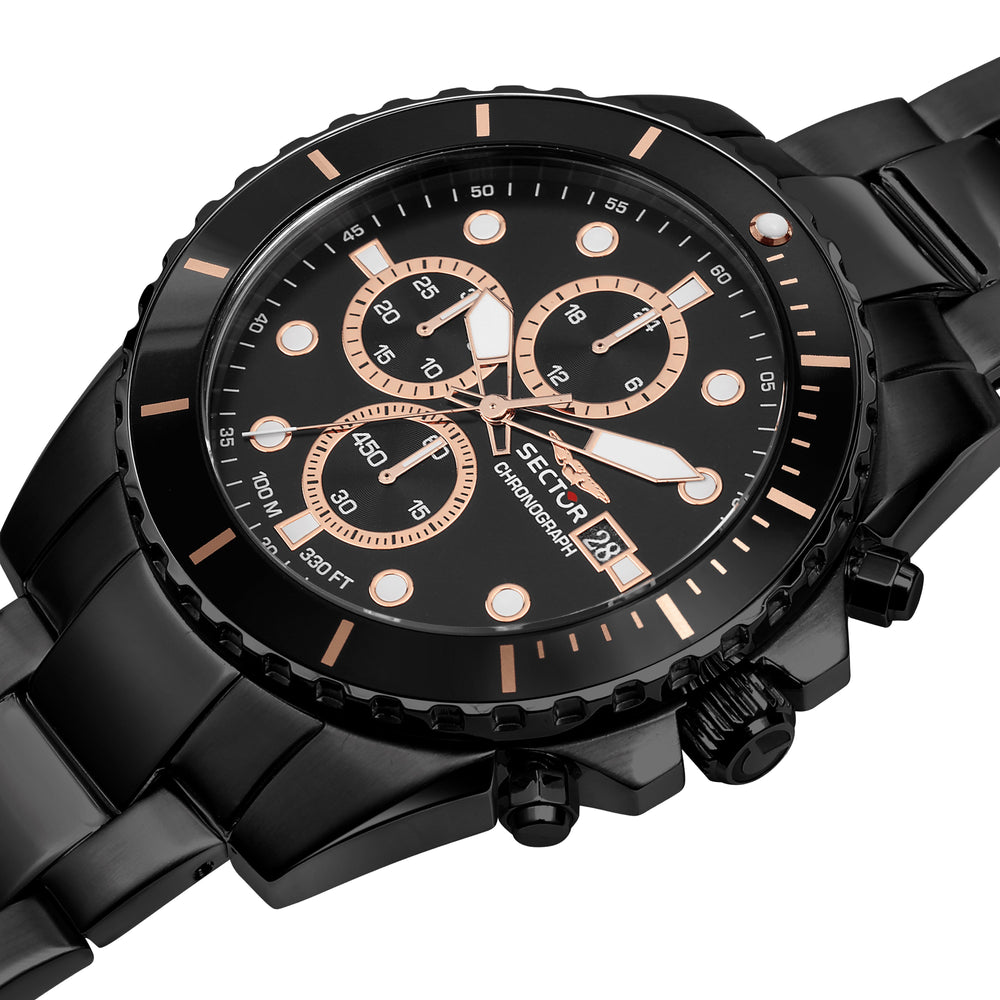 Orologio Uomo SECTOR della collezione 450. Orologio con movimento MVT. MJS15, funzione Cronografo. Quadrante: Cronografo UPMR c/datario a ore 3, finitura Lucido e satinato, colore NERO. SUNRAY. Tipo cinturino: Cap-Folded. Materiale cinturino: Bracciale in Metallo di colore Nero. Cassa in Vetro minerale di dimensioni 43. Chiusura: Fibbia Diver con blocco sicurezza. Resistenza all'acqua: 10 ATM. Peso: 157 gr. Codice prodotto: R3273776005. Colore: NERO. Materiali: Acciaio. PVD nero. PVD blu. Confezione: scatola originale SECTOR. Garanzia: garanzia internazionale SECTOR