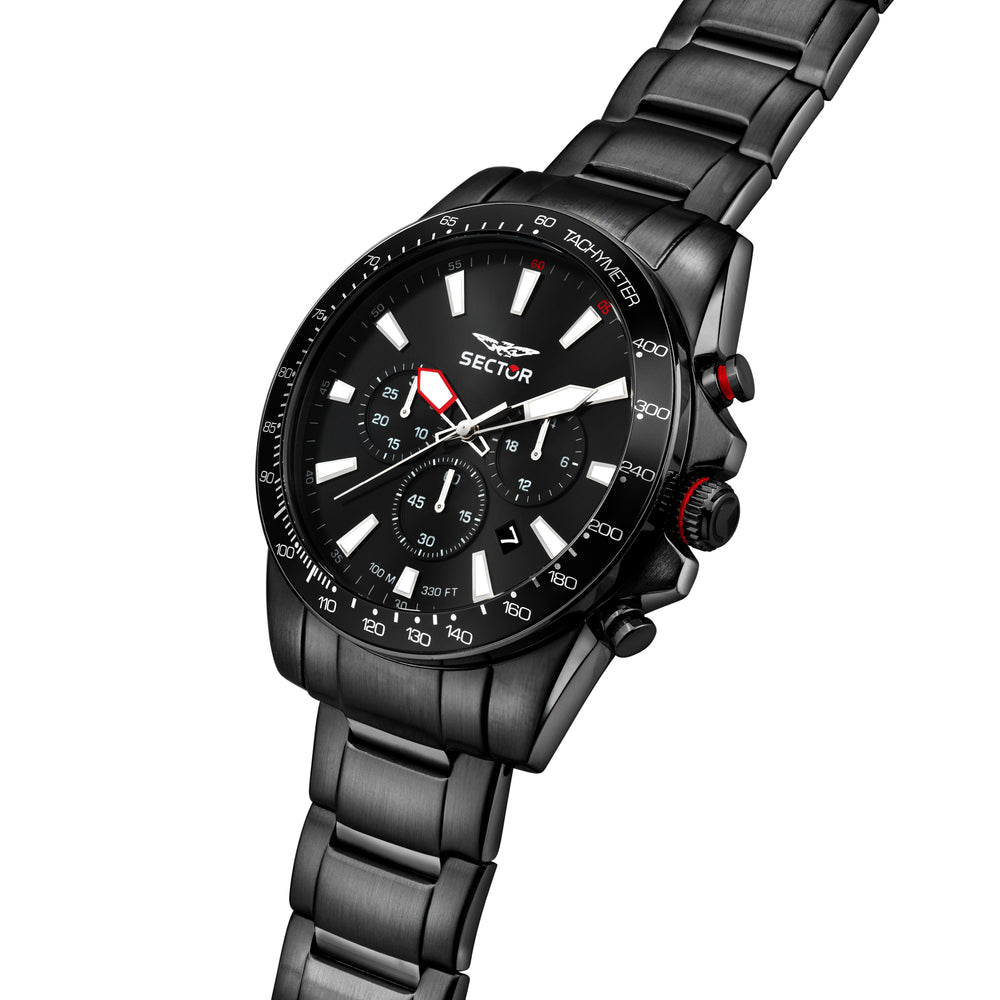 Orologio Uomo SECTOR della collezione 450. Orologio con movimento MVT.MIYOTA JS25, funzione Cronografo. Quadrante: Cronografo indice applicato con datario a 4.5 ore, finitura Lucido e satinato, colore NERO. SUNRAY. Tipo cinturino: Ribordato vero. Materiale cinturino: Bracciale in Metallo di colore Grigio. Cassa in Vetro minerale di dimensioni 43. Chiusura: Fibbia Diver c/pulsanti e blocco di sicurezza. Resistenza all'acqua: 10 ATM. Peso: 163 gr. Codice prodotto: R3273776006. Colore: CANNA DI FUCILE. Materiali: Acciaio. Confezione: scatola originale SECTOR. Garanzia: garanzia internazionale SECTOR