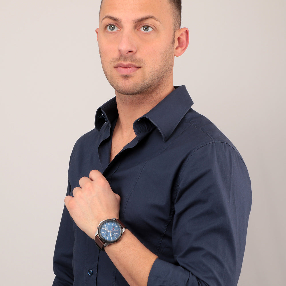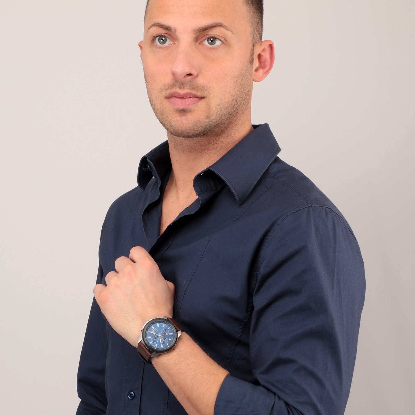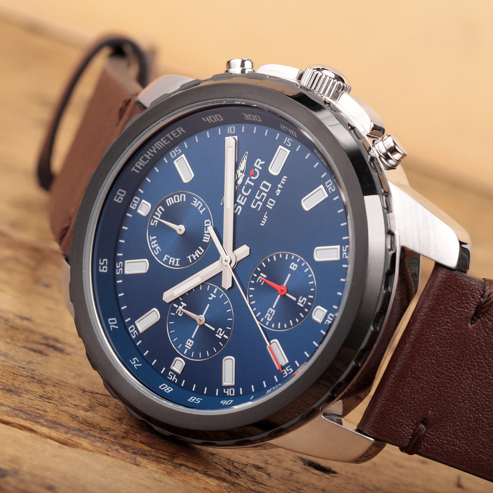 Orologio Uomo SECTOR della collezione 550. Orologio con movimento MVT EPSON VX9NE, funzione Multifunzione. Quadrante: Multifunzione UPMR, finitura acciaio e PVD nero, colore BLU. Tipo cinturino: Tranciato. Materiale cinturino: Bracciale in Pelle di colore Marrone. Cassa in Vetro minerale di dimensioni 45. Chiusura: Fibbia ARDIGLIONE. Resistenza all'acqua: 10 ATM. Peso: 80 gr. Codice prodotto: R3251412001. Materiali: Acciaio. PVD Nero. Pelle naturale. Confezione: scatola originale SECTOR. Garanzia: garanzia internazionale SECTOR