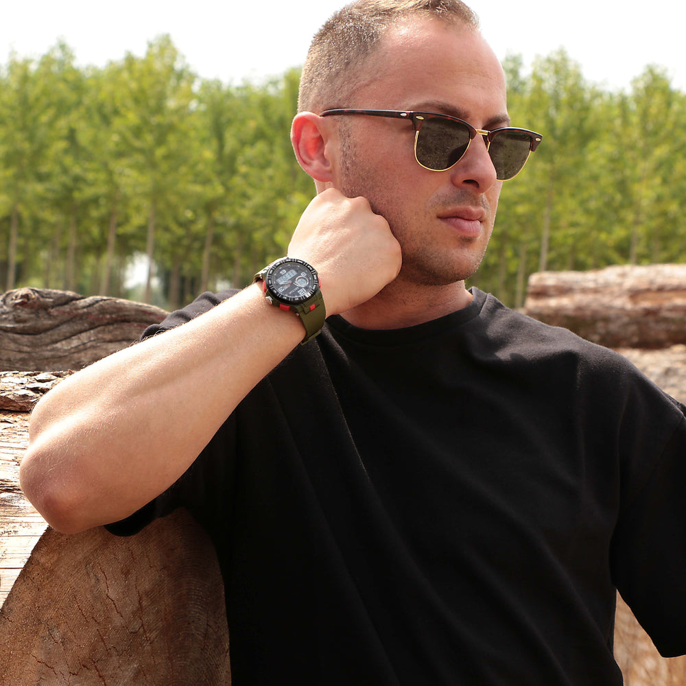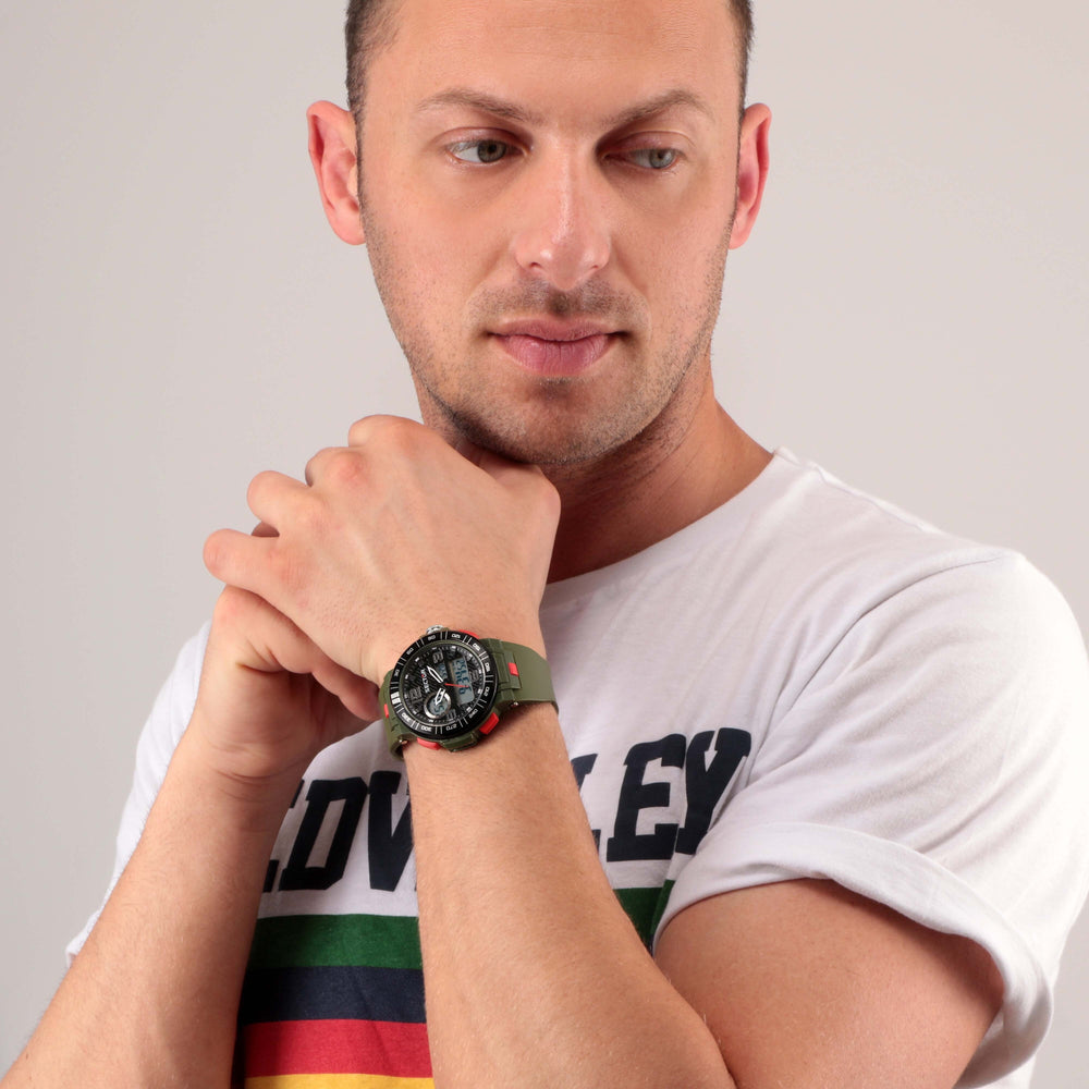 Orologio Uomo SECTOR della collezione EX-28. Orologio con movimento MVT.DIGITAL, funzione Digitale. Quadrante: 3 lancette indici + digitale, finitura ABS plastica, colore NERO. Tipo cinturino: iniezione pu. Materiale cinturino: Pu di colore Verde. Cassa in Lente in plastica di dimensioni 46. Chiusura: Fibbia ARDIGLIONE. Resistenza all'acqua: 5 ATM. Peso: 40,1 gr. Codice prodotto: R3251532001. Colore: VERDE. Materiali: ABS. PU. Confezione: scatola originale SECTOR. Garanzia: garanzia internazionale SECTOR
