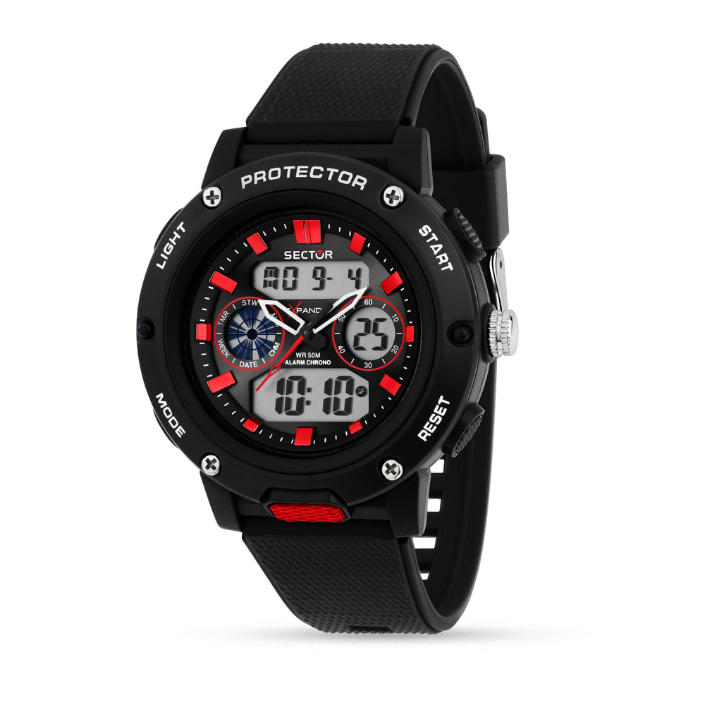 Orologio Uomo SECTOR della collezione EX-44. Orologio con movimento MVT.DIGITAL, funzione Digitale. Quadrante: 3 lancette con digitale, finitura ABS. Opaco, colore NERO. SUNRAY. Tipo cinturino: iniezione pu. Materiale cinturino: Bracciale in Plastica di colore Nero. Cassa in Lente in plastica di dimensioni 47. Chiusura: Fibbia ARDIGLIONE. Resistenza all'acqua: 5 ATM. Peso: 95 gr. Codice prodotto: R3251292002. Colore: NERO. Materiali: ABS.PC. Confezione: scatola originale SECTOR. Garanzia: garanzia internazionale SECTOR
