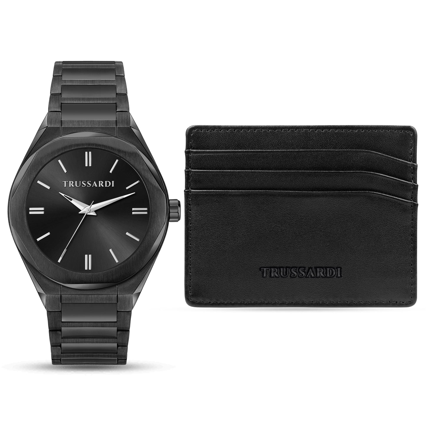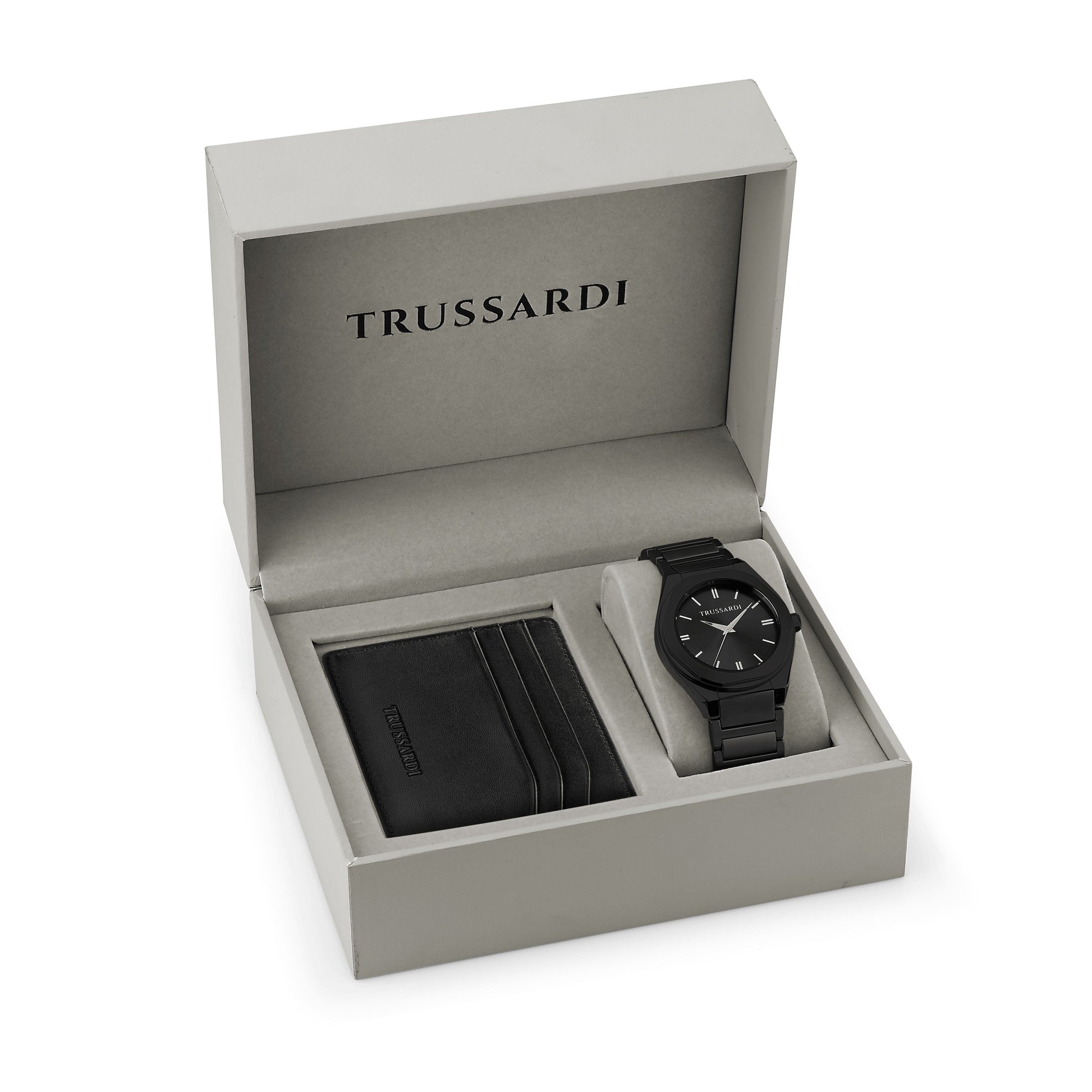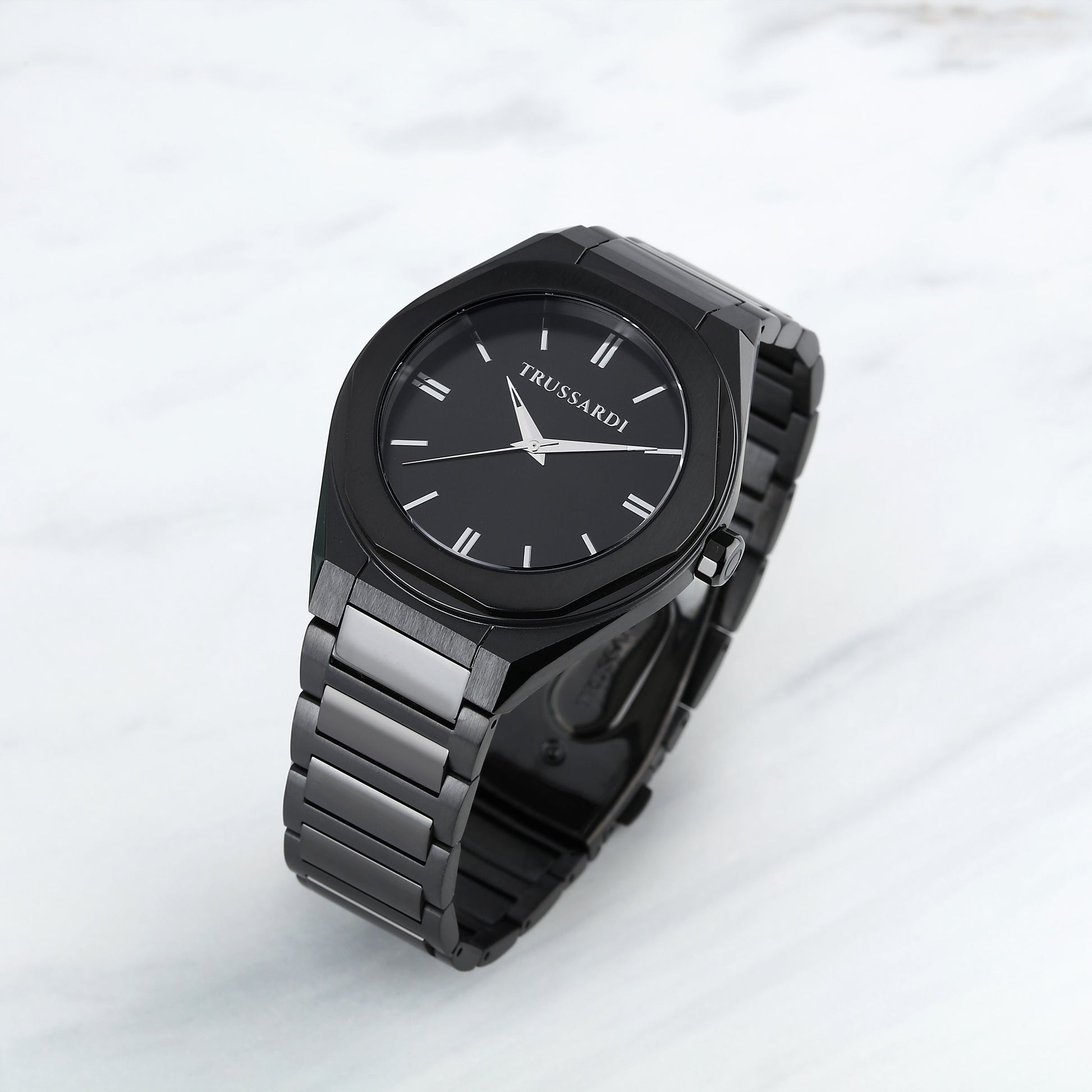 Orologio Uomo TRUSSARDI della collezione BRINK. Orologio con movimento MVT. M2035, funzione Solo tempo. 3H. Quadrante: 3 lancette UPMR a ore 1-12, finitura Acciaio lucido + sabbiato + spazzolato, colore NERO. SUNRAY. Tipo cinturino: Solid. Materiale cinturino: Bracciale in Metallo di colore Nero. Cassa in Vetro minerale di dimensioni 42. Chiusura: Fibbia DEPLOYANTE con pulsanti. Resistenza all'acqua: 5 ATM. Peso: 185 gr. Codice prodotto: R2453156007. Colore: NERO. Materiali: Acciaio. IP nero. Confezione: scatola originale TRUSSARDI. Garanzia: garanzia internazionale TRUSSARDI