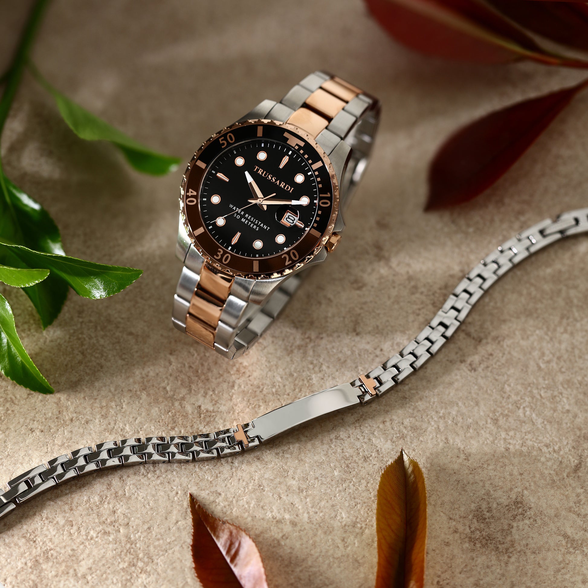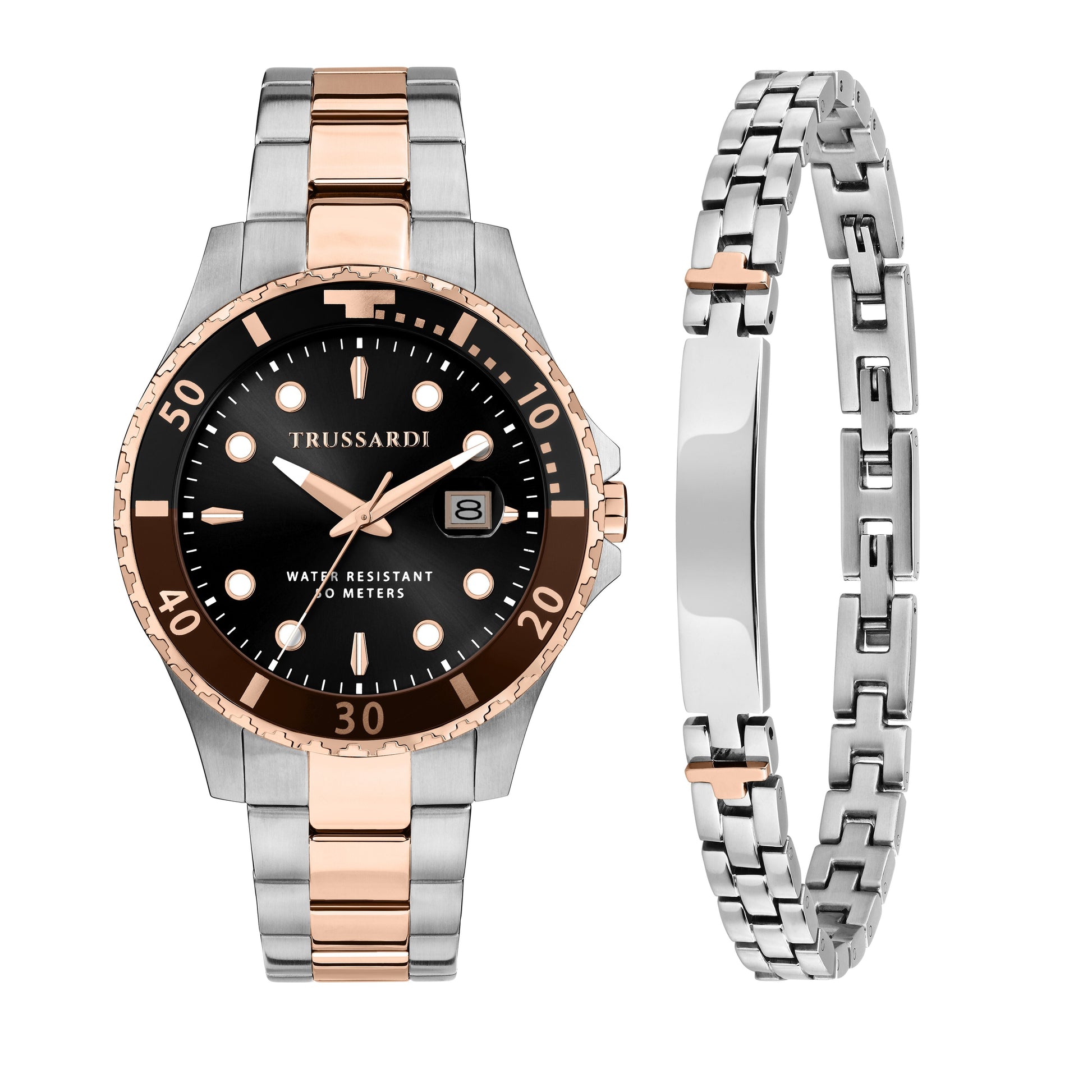 OROLOGIO UOMO TRUSSARDI CITY LIFE R2453169001. Orologio Tempo, Data con movimento MVT. MIYOTA 2115. Colore: ARGENTO. Materiali: Acciaio. Quadrante in Vetro minerale, lente d'ingrandimento di colore NERO, SUNRAY con 3 lancette indici UPMR, finitura in Lucido e satinato. Dimensioni cassa: 42. Cinturino in Acciaio di tipo Semi-Solid e di colore Oro Rosa, Acciaio. Chiusura: Fibbia DEPLOYANTE con pulsanti. Confezione: scatola originale TRUSSARDI. Prodotto con garanzia internazionale TRUSSARDI.