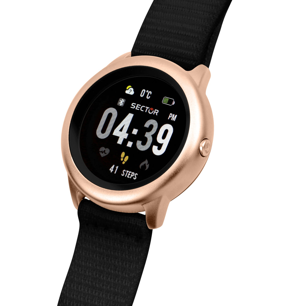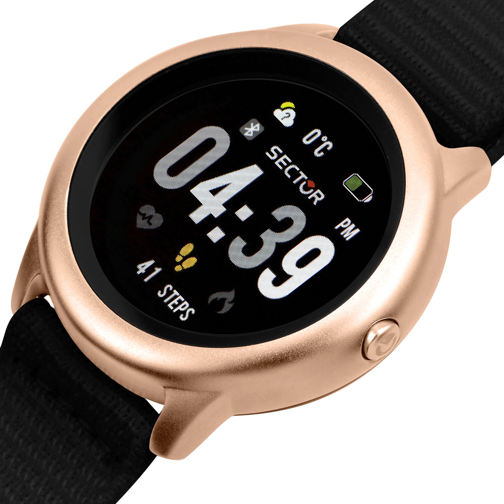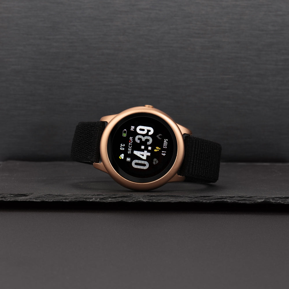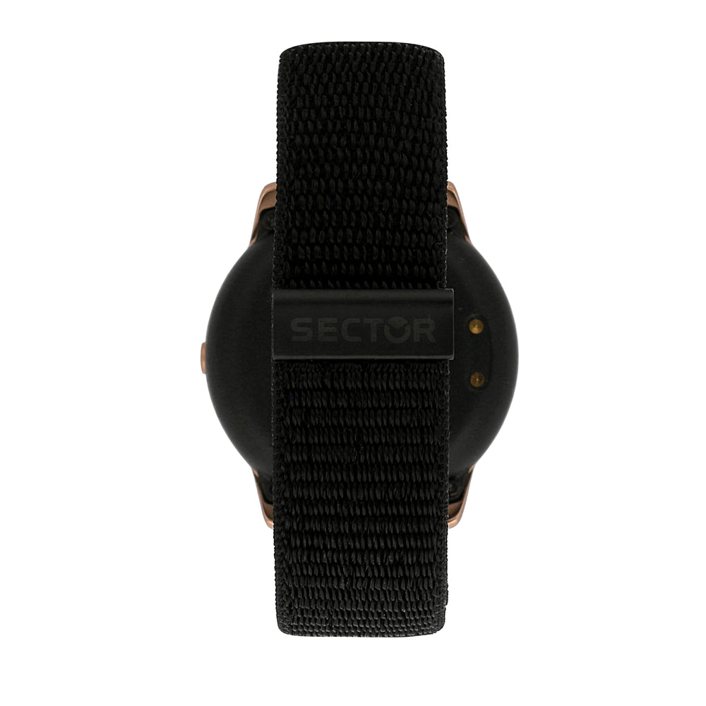 SMARTWATCH SECTOR S-01 R3251157001. Genere: Uomo, Materiale e finitura cassa: Lega di metallo, Materiale sintetico, Misura cassa: 45,5 mm, Spessore cassa: 13,30, Colore cassa: Oro rosa, Vetro: Vetro minerale, Materiale cinturino: Pelle, Colore cinturino: Nero, Chiusura: Velcro, Movimento: Digitale, Water resistant: Ip67, Garanzia: Ufficiale 2 anni Sector, Confezione: Originale Sector